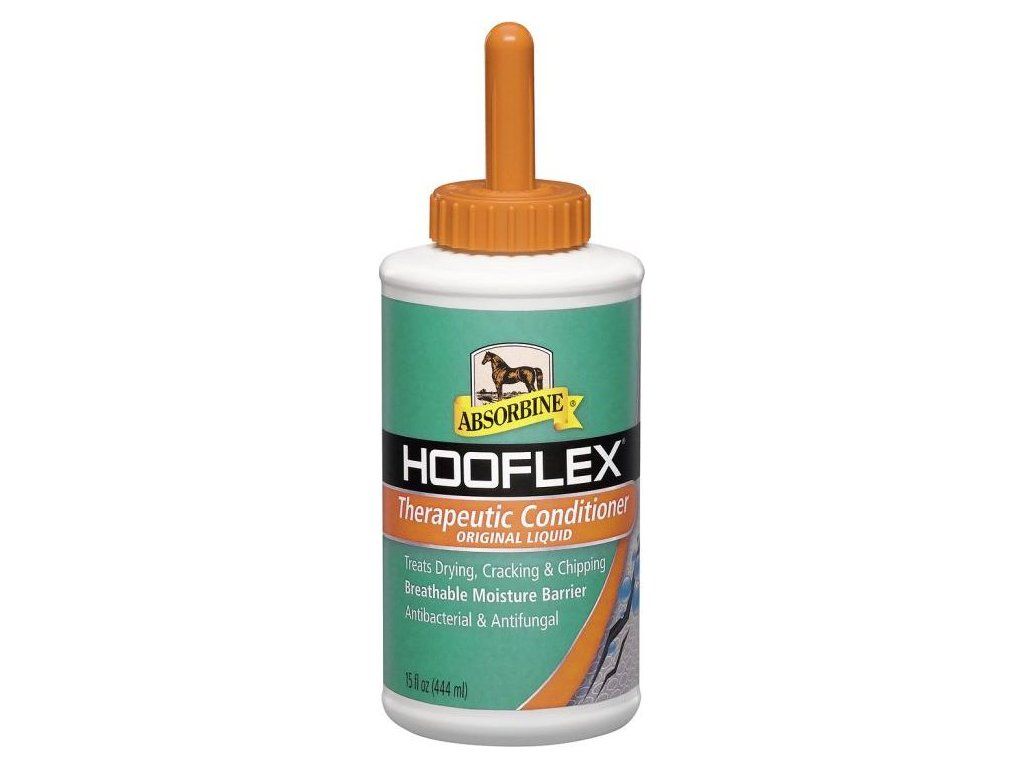 Absorbine Hooflex kondicionér na kopytá je ľahko aplikovateľný olej, ktorý vytvára priedušnú bariéru, ktorá pomáha udržať vlhkosť v kopytách dlhší čas. Špičkový produkt v starostlivosti o kopytá. Zanecháva na kopytách zdravý lesk. Praktický štetec zabudovaný do uzáveru balenia urýchľuje aplikáciu, okolie sa toľko nezašpiní. Ošetruje krehké a lámavé kopytá. Obsahuje antibakteriálne a antimykotické zložky, ktoré pomáhajú predchádzať infekciám. Funguje za sucha aj za mokra. Pomáha obnoviť a udržať pružné a zdravé kopytá