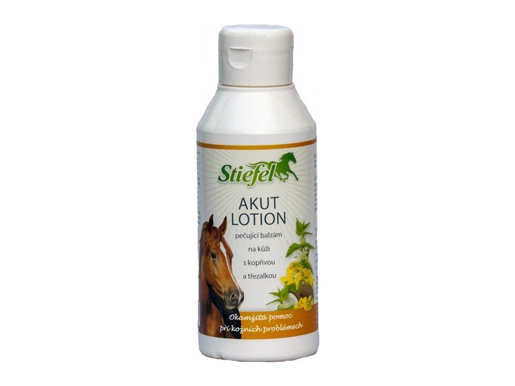 Stiefel Akut lotion je špeciálne mlieko určené na starostlivosť o kožu pri kožných infekciách (najmä pri podlomoch), ale aj pri mechanických poškodeniach a odreninách, popáleninách od slnka, svrbivých kožných vyrážkach (najmä v letnom období) atď. Určené pre citlivé a alergické kone. Rastlinné výťažky zo žihľavy, ľubovníka bodkovaného a klinčekov podporujú hojenie kože. Mlieko sa rýchlo a bezo zvyšku vstrebáva do kože, zjemňuje ju a zvláčňuje bez mastných zvyškov. Vytvára ochranný film, ktorý chráni pred hmyzom. Mlieko poriadne vmasírujte do postihnutých oblastí, aby účinné látky prenikli do kože a posilnili ju.