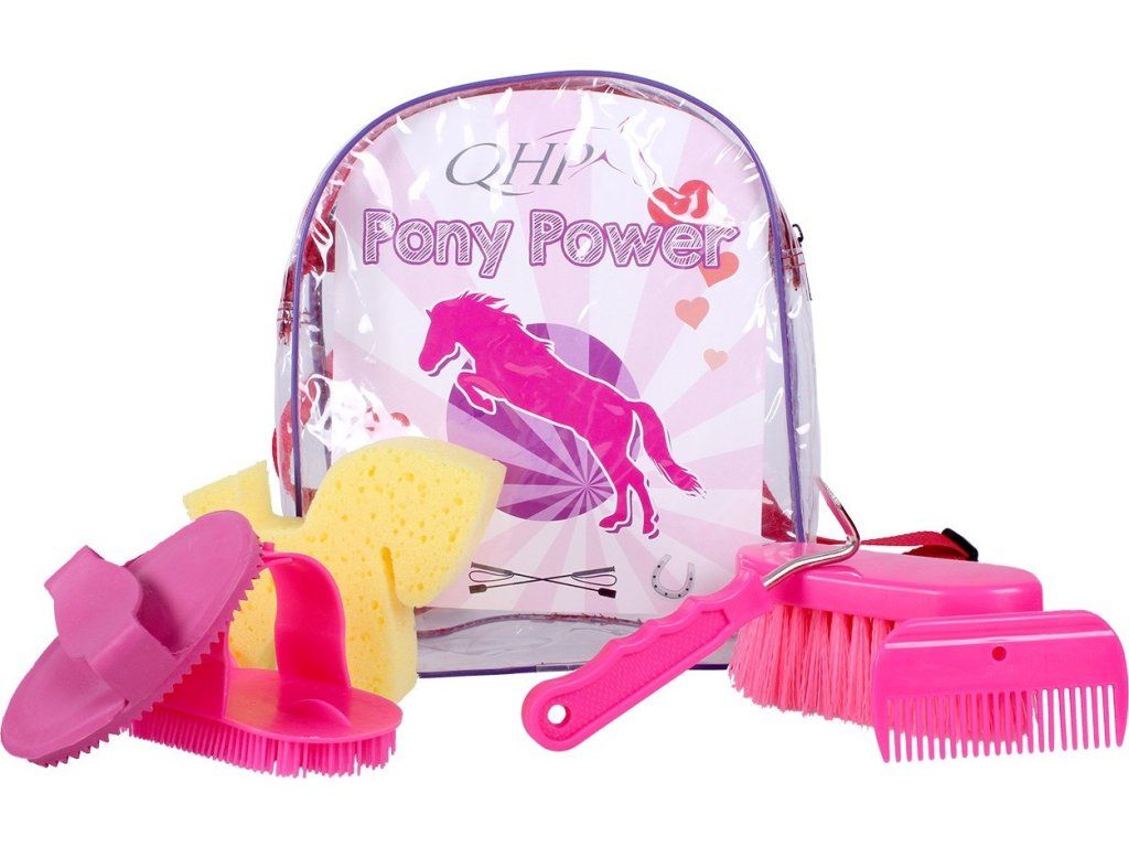 Batoh s čistením pre malé deti. Obsahuje masážne žbilko, plastové žbilko, mäkkú kefu, kopyťák, hrebienok na hrivu, špongiu.