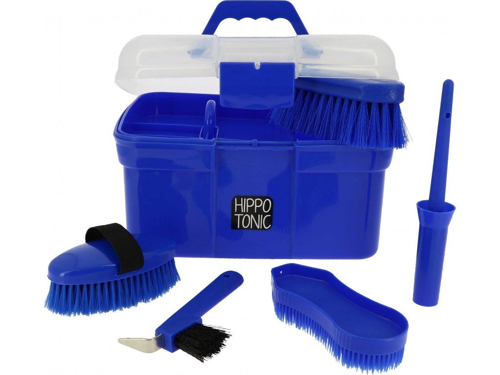 Malý vybavený čistiaci box s priehľadným vekom je praktickým pomocníkom pre starostlivosť o koňa doma aj na cestách. Vnútri nájdete všetko potrebné na každodenné čistenie. Box obsahuje odnímateľnú priehradku, háčik na kopytá, štetec na olej na kopytá s viečkom, viacúčelovú kefu, ryžovú kefu a kefu na telo z polypropylénu.