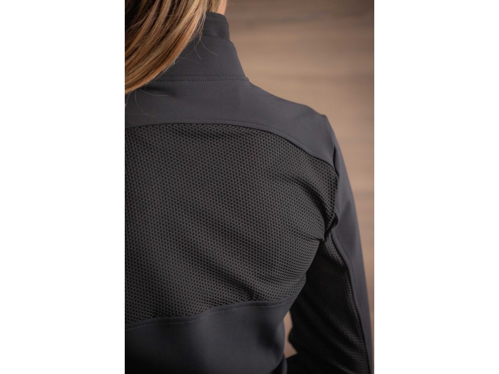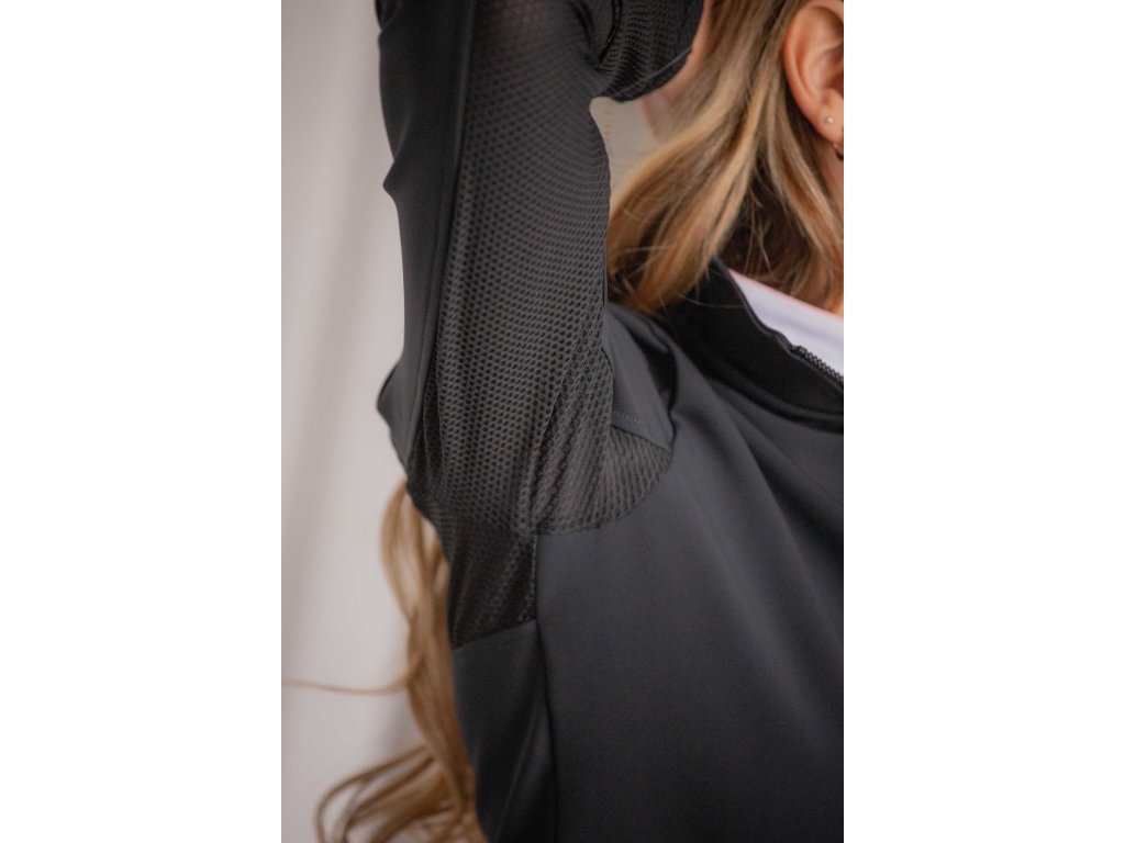 Dámska bunda Azylis je elegantná, ženská a dokonale sediaca bunda, ktorú využijete pri tréningu aj na voľný čas. Vďaka pružnému materiálu sa prispôsobí postave a pôsobí ako druhá koža. Pohodlne obopína telo a zároveň neobmedzuje v pohybe. Na prednej strane nájdete dve praktické vrecká a zips, ktorý uľahčuje obliekanie. Na hrudi je zdobená logom Penelope a na chrbte aj na vnútornej strane rukávov je umiestnená priedušná sieťovina. Tieto sieťované detaily zabezpečujú skvelú ventiláciu a príjemný komfort aj pri náročnejšom tréningu. Bunda má tiež vysoký golier, ktorý krásne rámcuje krk.