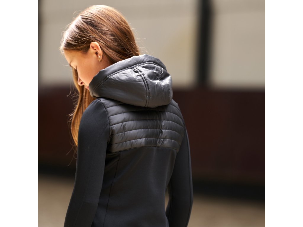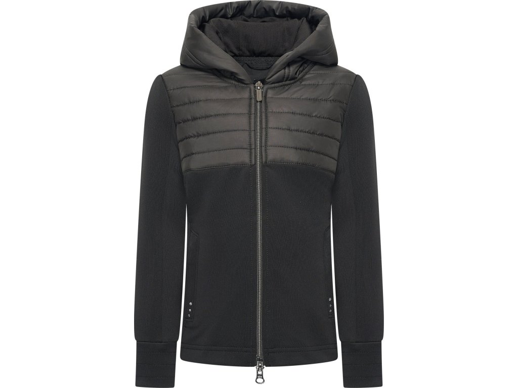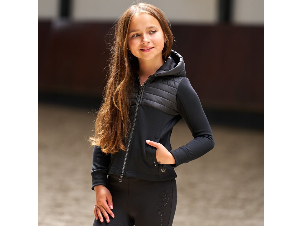 Štýlová a funkčná detská bunda, ktorá je vyrobená z mäkkej džersejovej látky a polstrovanej časti v oblasti hrudníka a chrbta. Vybavená veľkou polstrovanou kapucňou a prednými vreckami na zips. Elegantné horizontálne prešívanie dodáva bunde moderný vzhľad, zatiaľ čo obojsmerný zips poskytuje voľnosť pohybu pri jazde aj v stajni. Zdobená trblietavými kamienkami. Štýlové manžety s trojitým prešívaním dotvárajú dokonale vyladený dizajn, vďaka ktorému sa každá malá jazdkyňa bude cítiť skvele a sebavedome.