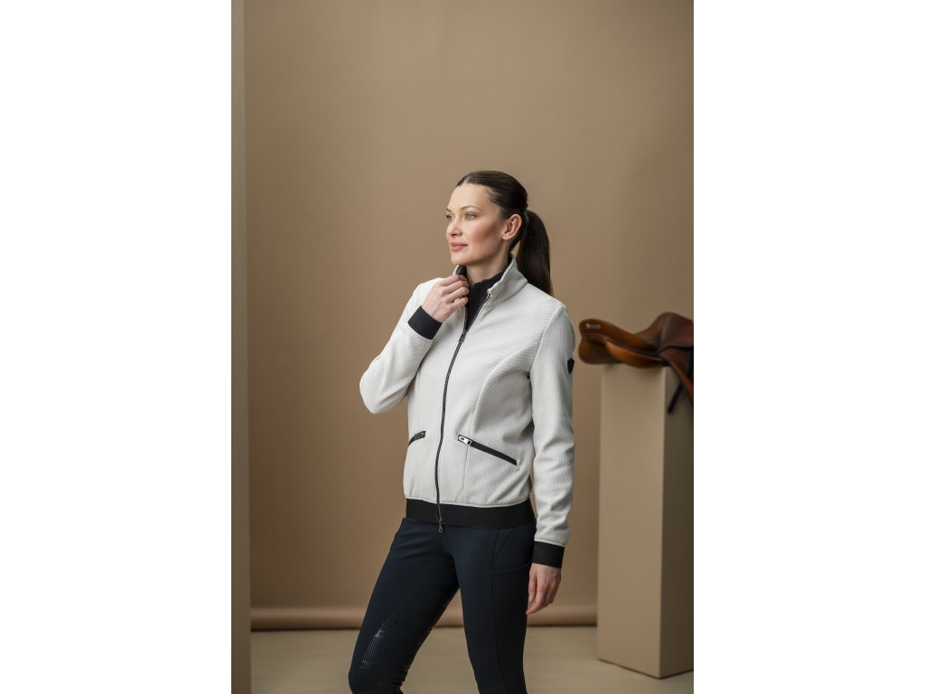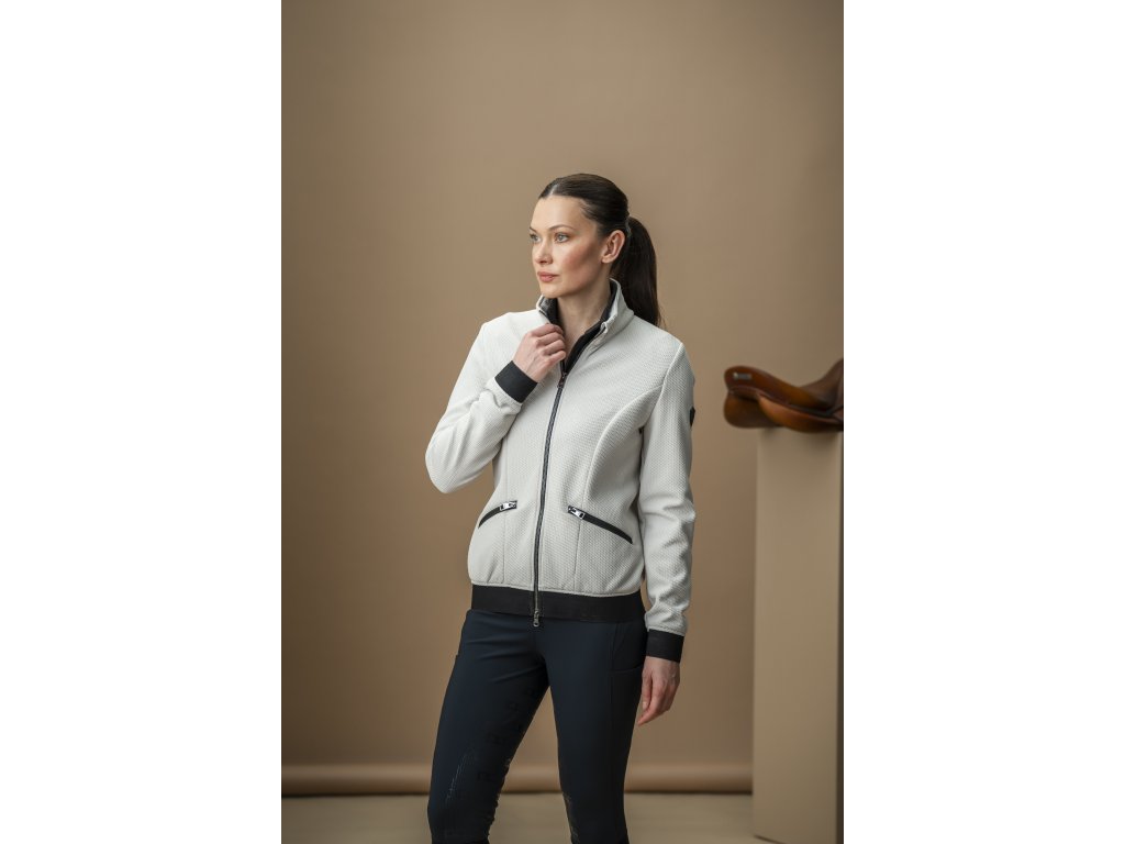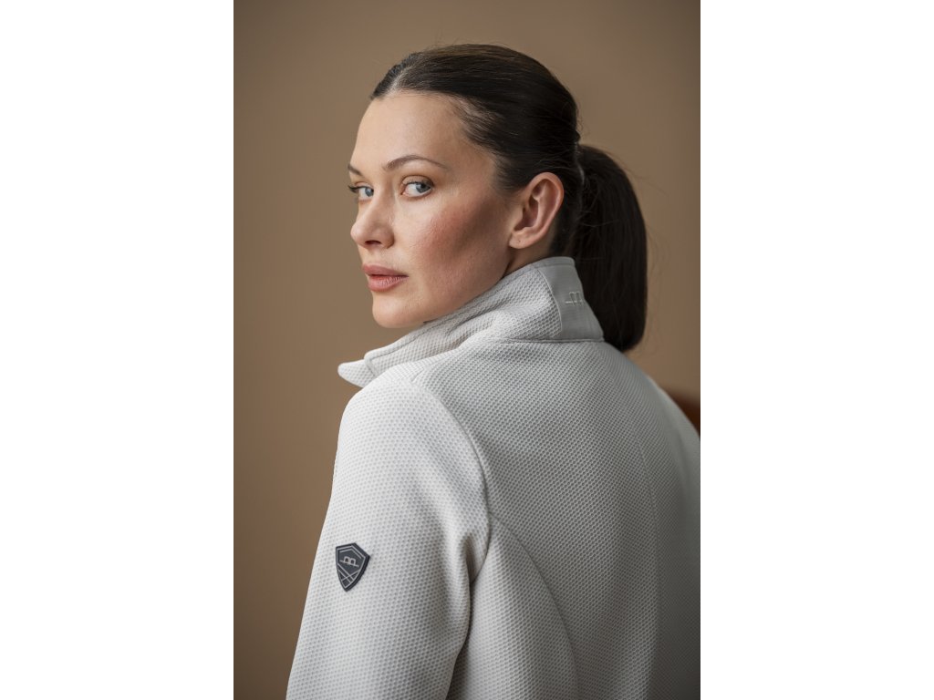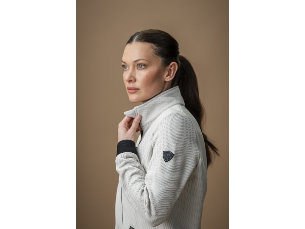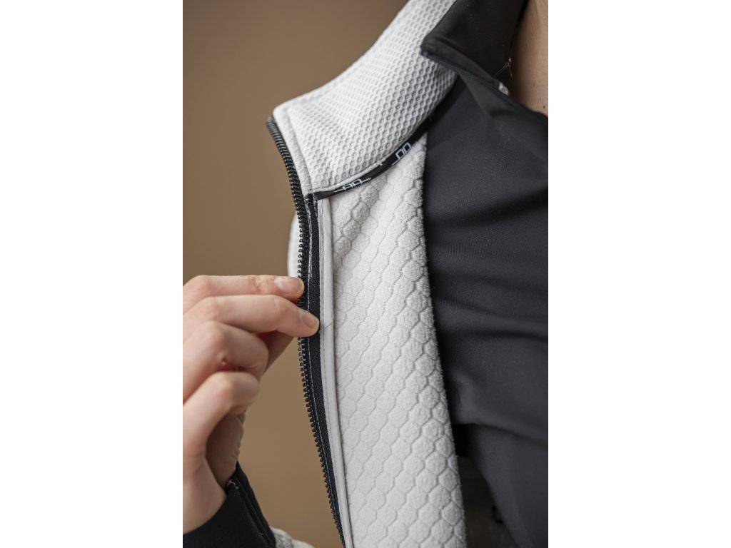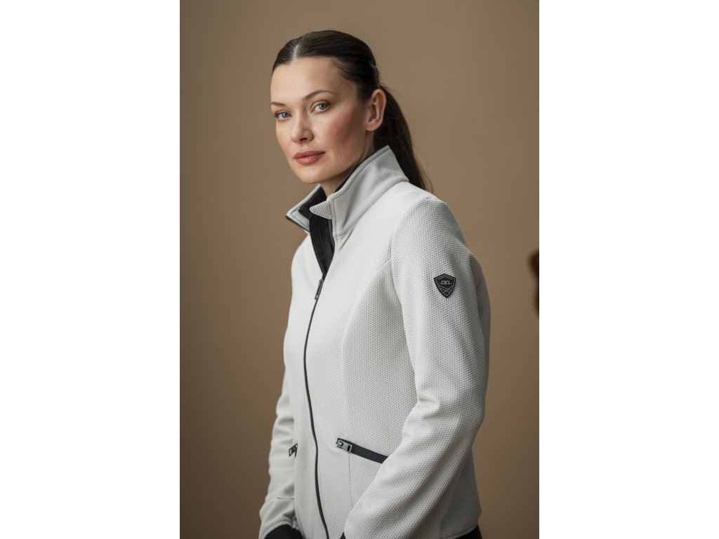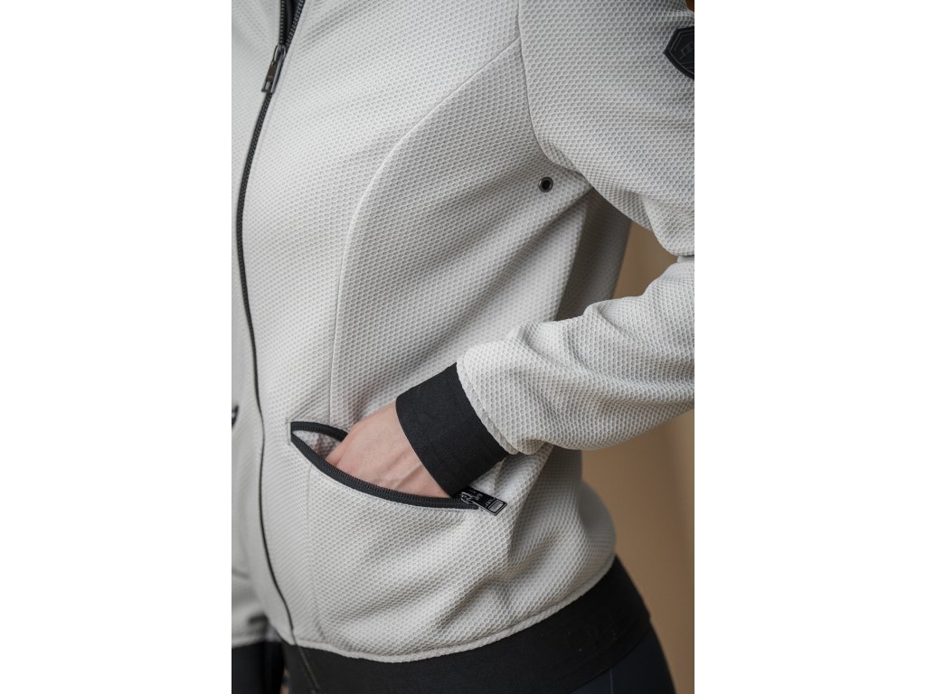 Dámska bunda Respira je funkčný celoročný kúsok, ktorý spája ľahkosť, pohodlie a moderné technológie. Je vyrobená z pružného materiálu s podielom nylonu a spandexu, doplneného o štruktúrovanú MotionLite sieťovinu a fleecovú podšívku. Táto kombinácia zaisťuje voľnosť pohybu, tepelný komfort a ochranu proti vetru. Premyslené detaily zahŕňajú vetracie otvory v podpazuší pre lepšiu priedušnosť, predný dvojcestný zips, elastické lemy s logom výrobcu a praktické vrecká na zips pre bezpečné uloženie drobností.