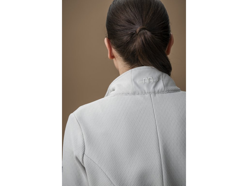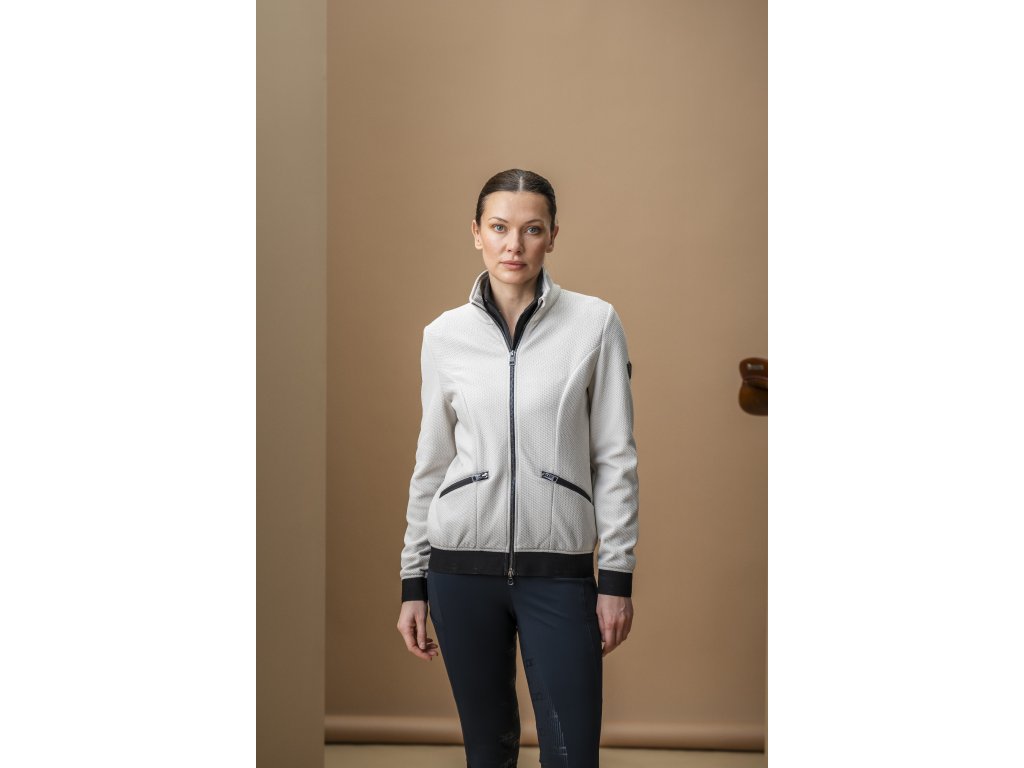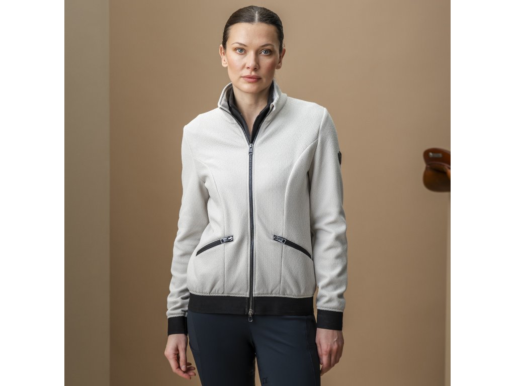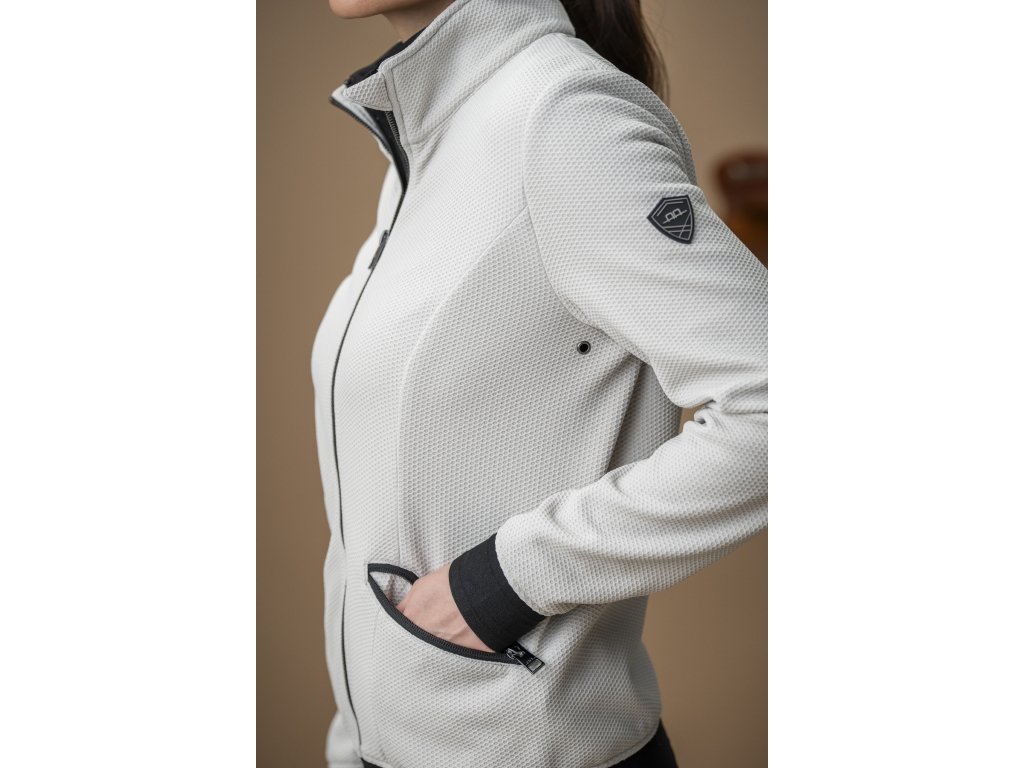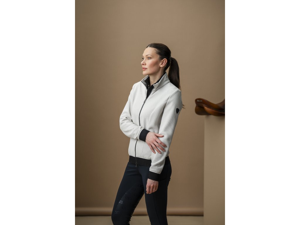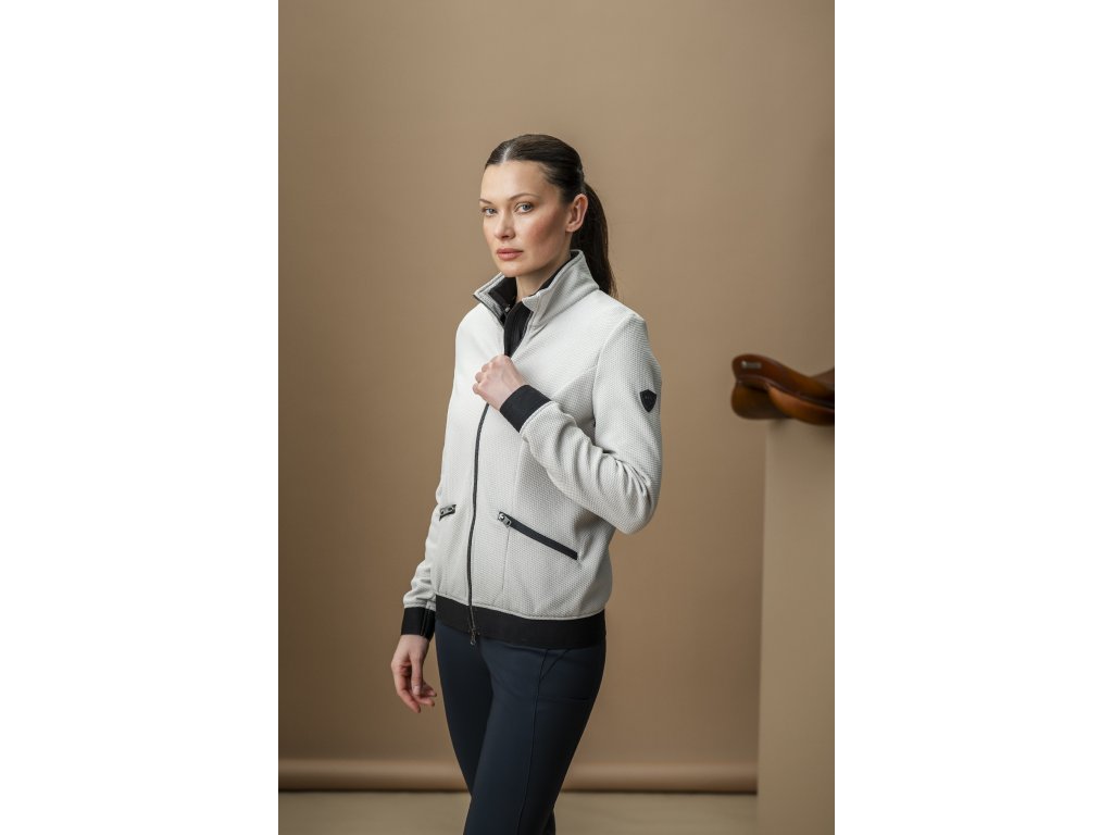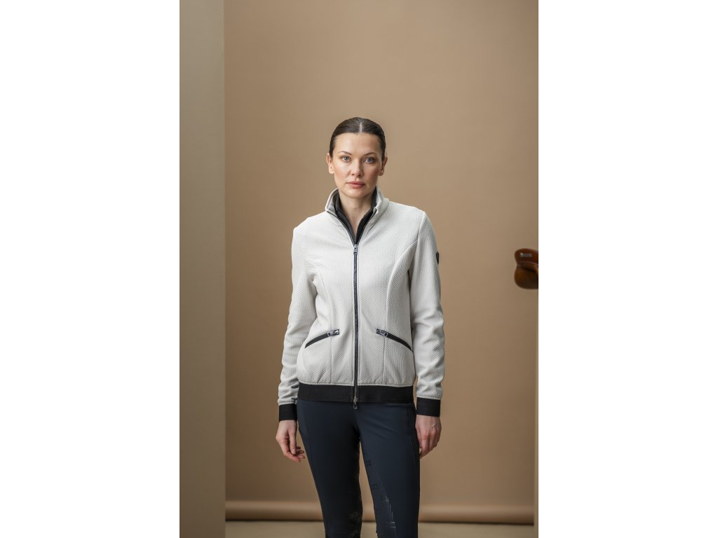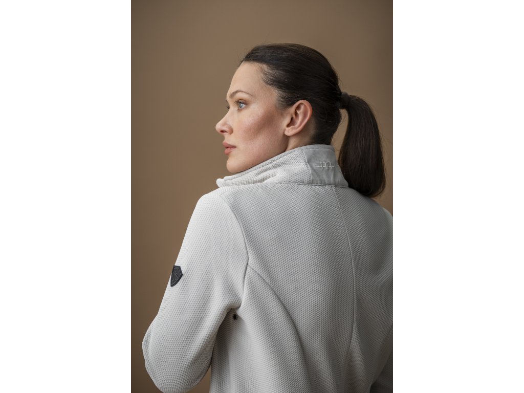 Dámska bunda Respira je funkčný celoročný kúsok, ktorý spája ľahkosť, pohodlie a moderné technológie. Je vyrobená z pružného materiálu s podielom nylonu a spandexu, doplneného o štruktúrovanú MotionLite sieťovinu a fleecovú podšívku. Táto kombinácia zaisťuje voľnosť pohybu, tepelný komfort a ochranu proti vetru. Premyslené detaily zahŕňajú vetracie otvory v podpazuší pre lepšiu priedušnosť, predný dvojcestný zips, elastické lemy s logom výrobcu a praktické vrecká na zips pre bezpečné uloženie drobností.