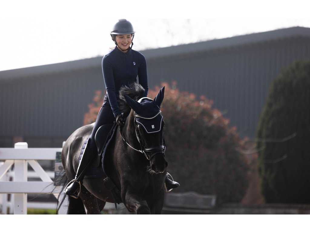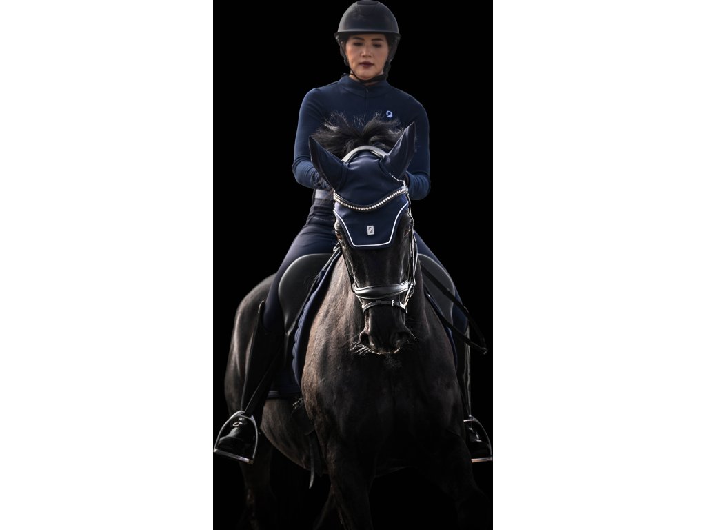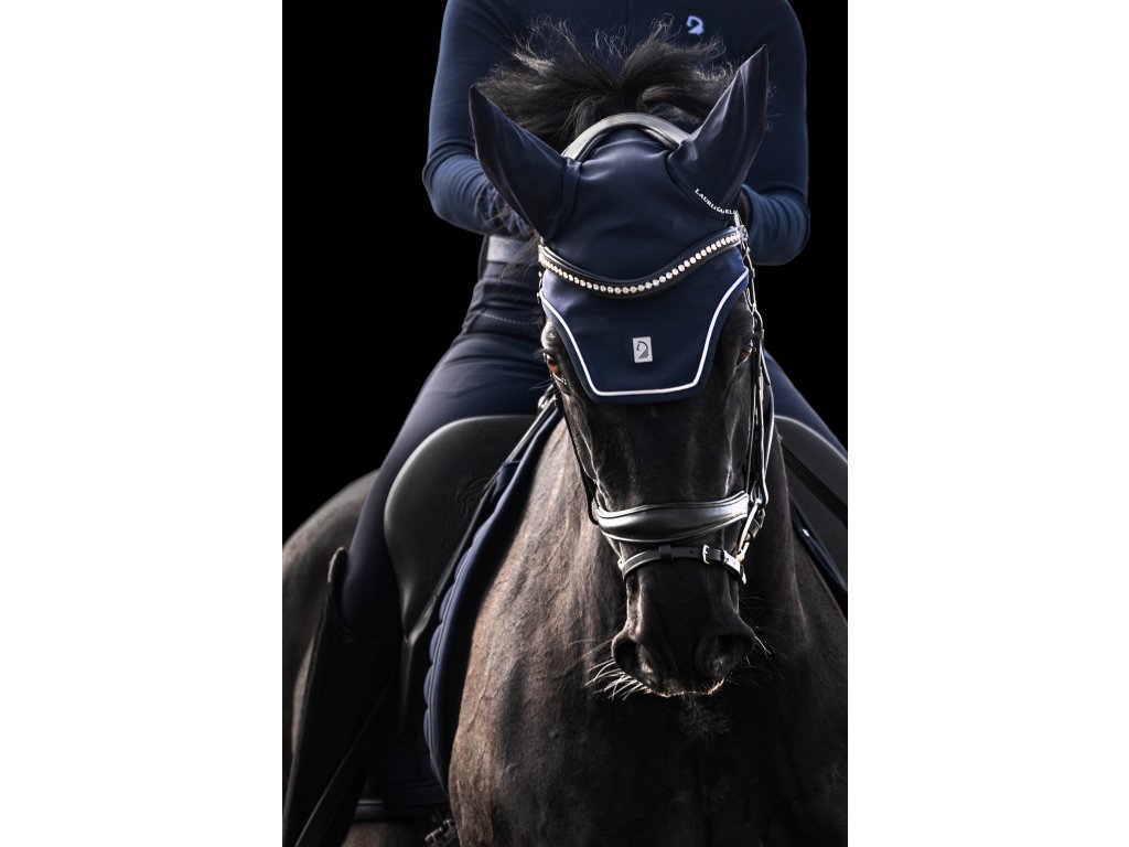 Kvalitní čabraka, která chrání uši koně před hmyzem a zabraňuje rozptylování během tréninku. Elastické uši zajišťují vysoký komfort a perfektní přizpůsobení. Čabraka je vyrobena z odolného a prodyšného materiálu a doplněna kvalitní metalickou aplikací.