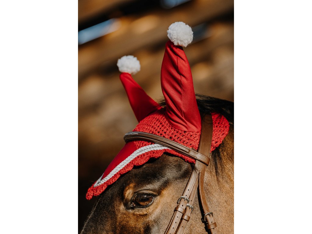 Vylaďte vánoční outfit vašeho koně s vánoční čabrakou. Tato čabraka je vyrobena z výrazného červeného materiálu a je zdobena stříbrnou paspulkou, která se třpytí. V oblasti uší je zdobena bambulkami v bílé barvě.