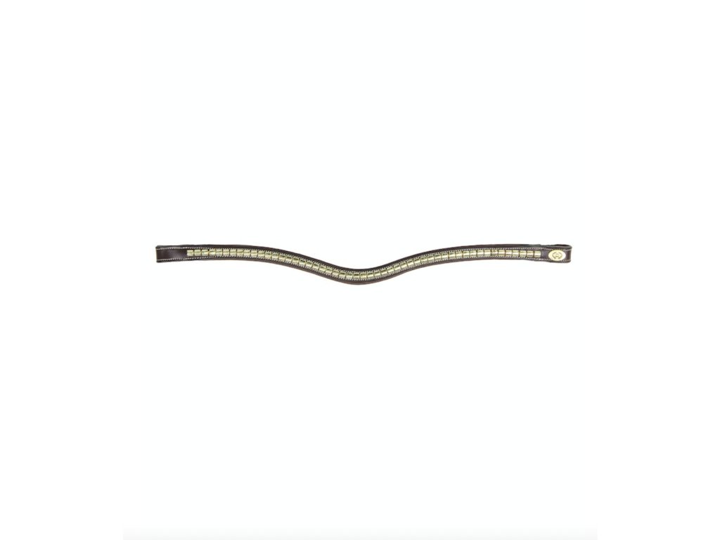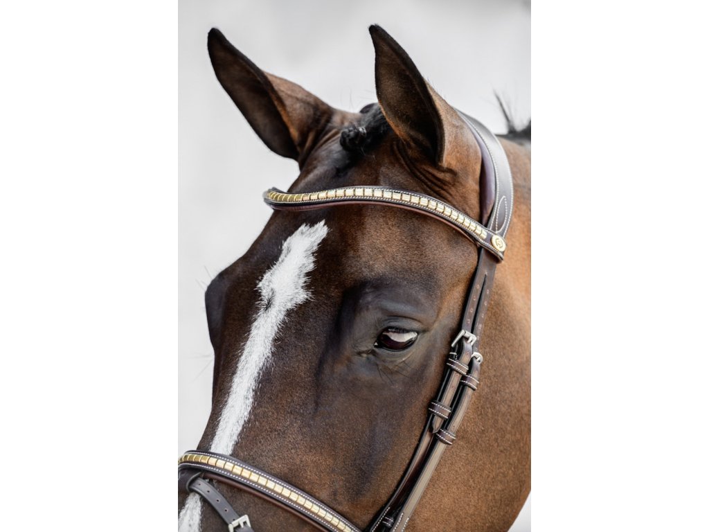 Štýlová čelenka s výrazným zlatým zdobením. Vnútorná strana čelenky je vybavená protišmykovou gumou, ktorá zabezpečuje jej nehybnosť. Zlaté zdobenie je pripevnené každé jednotlivo, čo zaručuje ich kvalitné pripevnenie k čelenke. Je to klasická čelenka bez funkcie Click-it. Čelenka je vyrobená v hnedom prevedení.