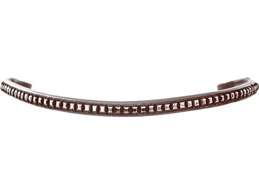 Elegantná čelenka vyrobená z vysokokvalitnej mäkkej kože. Zdobená kamienkami v striebornej farbe. Prispôsobí sa všetkým typom anglických uzdečiek. K dispozícii aj v čiernej farbe. Vo veľkostiach Cob a Full.