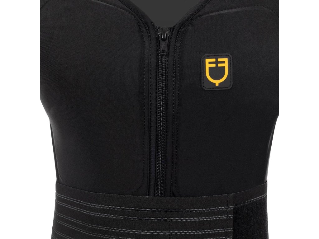 Vysokokvalitný chránič chrbtice vyrobený zo špeciálnej 3D tkaniny S.R.T. (Sweat Removing Textile), ktorá je vysoko priedušná a odvádza pot. Vnútorné polstrovanie vyrobené z materiálu E.V.C. (Evoluted Viscoelastic Cells), vodoodolná protinárazová guma. Chránič je mimoriadne ľahký, flexibilný a priedušný. Je vybavený štyrmi špeciálnymi vypchávkami (dve vpredu a dve po stranách), ktoré dokonale tlmia nárazy a poskytujú dodatočnú ochranu. Dosahuje úroveň 2 podľa EN1621-2. Ľahko sa oblieka a vyzlieka vďaka praktickému prednému zipsu. Je vybavený elastickým bedrovým pásom zaisťujúcim stabilitu. Zdobený logom Equestro na prednej aj zadnej strane. K dispozícii aj vo farbe yellow.