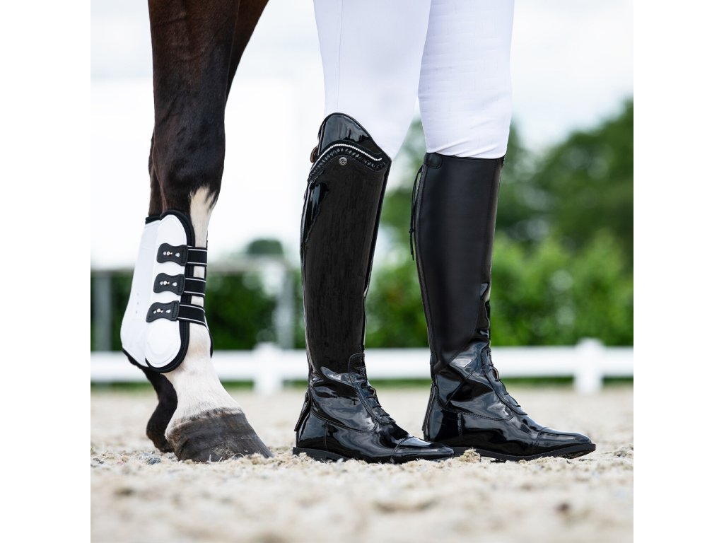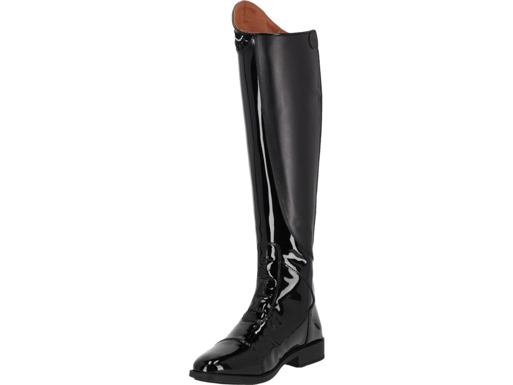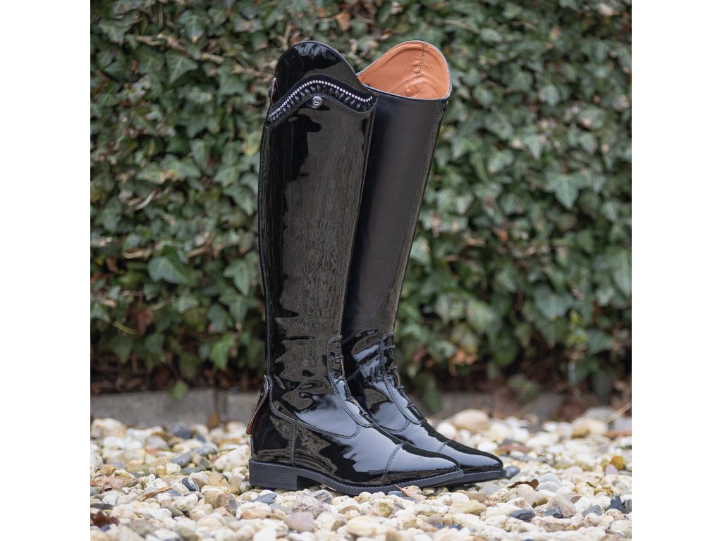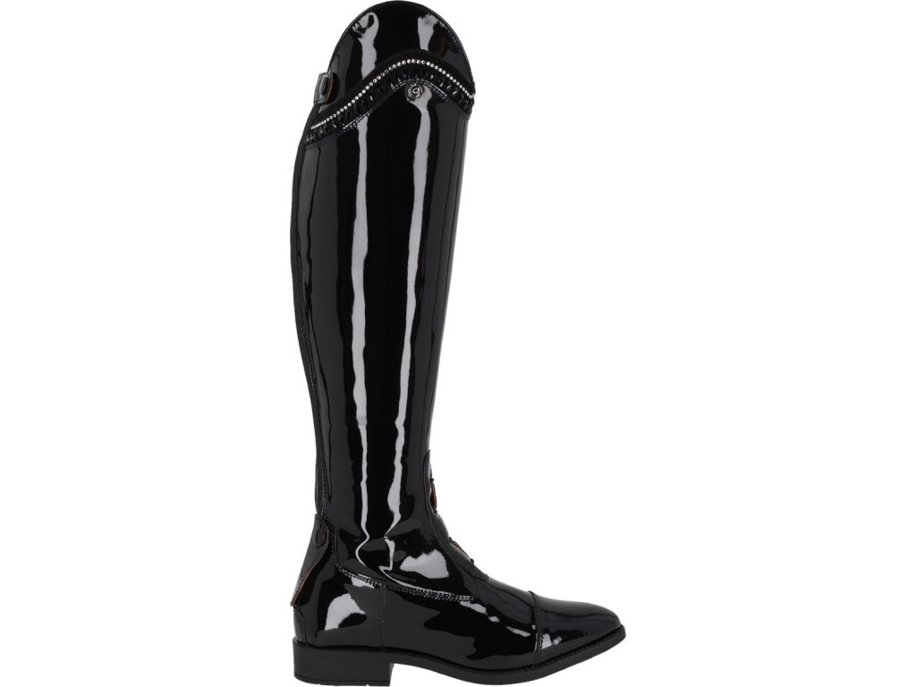 Vysoké jazdecké čižmy Lamira pôsobia luxusným dojmom vďaka kombinácii lakovanej kože a trblietavých detailov. Dekoratívne šnurovanie dodáva čižmám výrazný vzhľad a zároveň poskytuje väčšiu voľnosť pohybu v oblasti členku. Pohodlie zaisťujú elastické vložky na zadnej aj vnútornej strane. Zapínanie je riešené pomocou zipsu s ochranou a cvokom na zadnej strane. Vnútro čižmy je kompletne vyrobené z kože, čo zaisťuje maximálny komfort aj dlhú životnosť. Lamira sú elegantné čižmy, ktoré spájajú štýl a pohodlie v dokonalej rovnováhe.