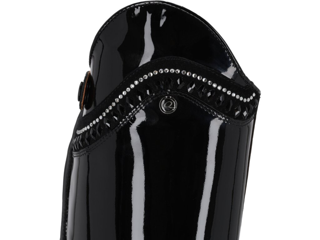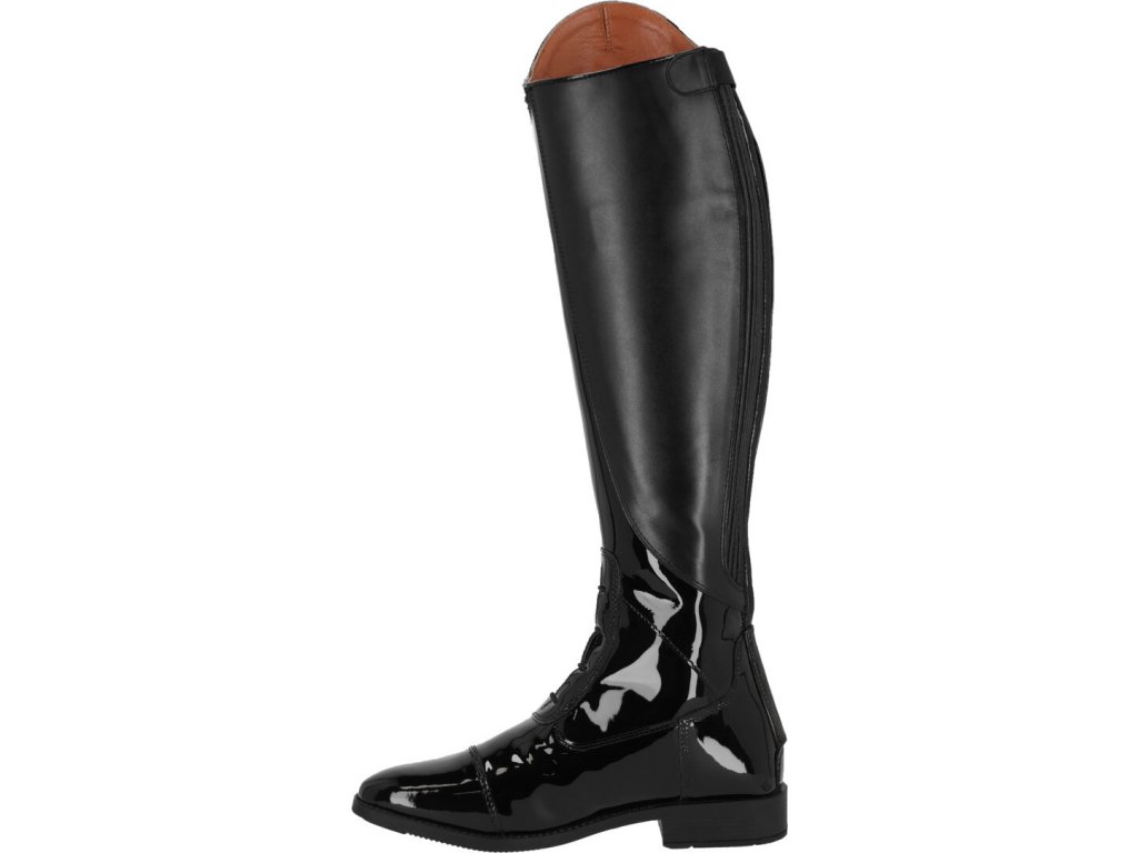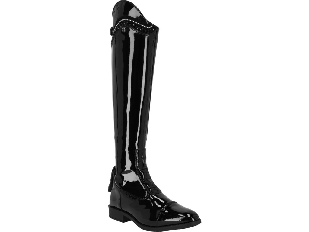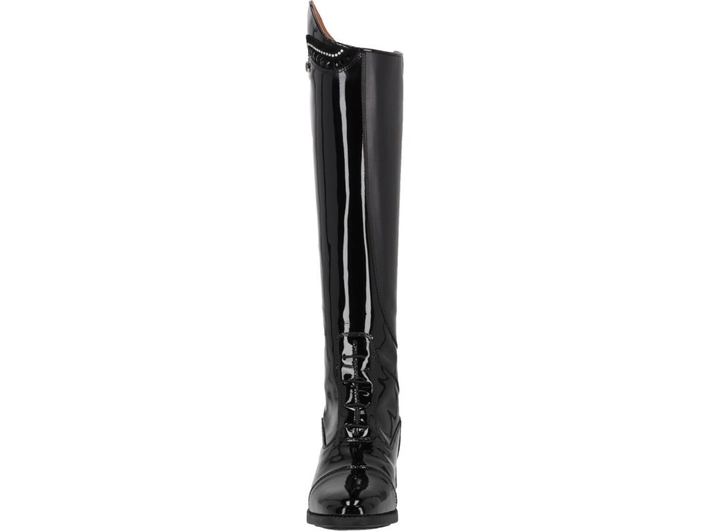 Vysoké jazdecké čižmy Lamira pôsobia luxusným dojmom vďaka kombinácii lakovanej kože a trblietavých detailov. Dekoratívne šnurovanie dodáva čižmám výrazný vzhľad a zároveň poskytuje väčšiu voľnosť pohybu v oblasti členku. Pohodlie zaisťujú elastické vložky na zadnej aj vnútornej strane. Zapínanie je riešené pomocou zipsu s ochranou a cvokom na zadnej strane. Vnútro čižmy je kompletne vyrobené z kože, čo zaisťuje maximálny komfort aj dlhú životnosť. Lamira sú elegantné čižmy, ktoré spájajú štýl a pohodlie v dokonalej rovnováhe.