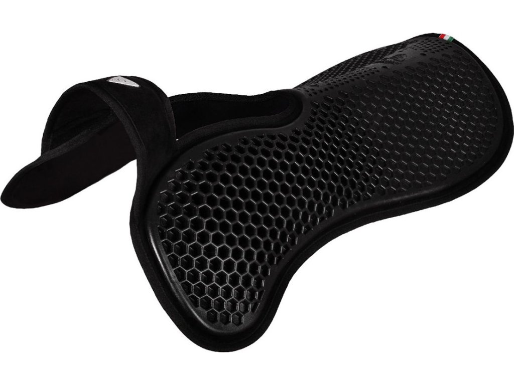 Tlmiaca gélová podložka na uvoľnenie kohútika s integrovaným predným riserom (vyvýšenou časťou) a pamäťovou penou. Maximálna hrúbka 25 mm v prednej časti je ideálna na kompenzáciu nedostatkov v sedle a ako cielené dodatočné polstrovanie. Hexagonová gélová štruktúra zabezpečuje, že vzduch je stlačený vo vnútri buniek a je vypudzovaný pri pohybe koňa, čím sa pod sedlom vytvorí mäkký vankúš a umožňuje cirkuláciu vzduchu. Jedna univerzálna veľkosť, štyri farebné varianty. Maximálna hrúbka podložky vpredu (kvôli riseru): 25 mm. Minimálna hrúbka podložky vzadu: 7 mm. Dečka je v čiernej farbe s čiernym gélom.
