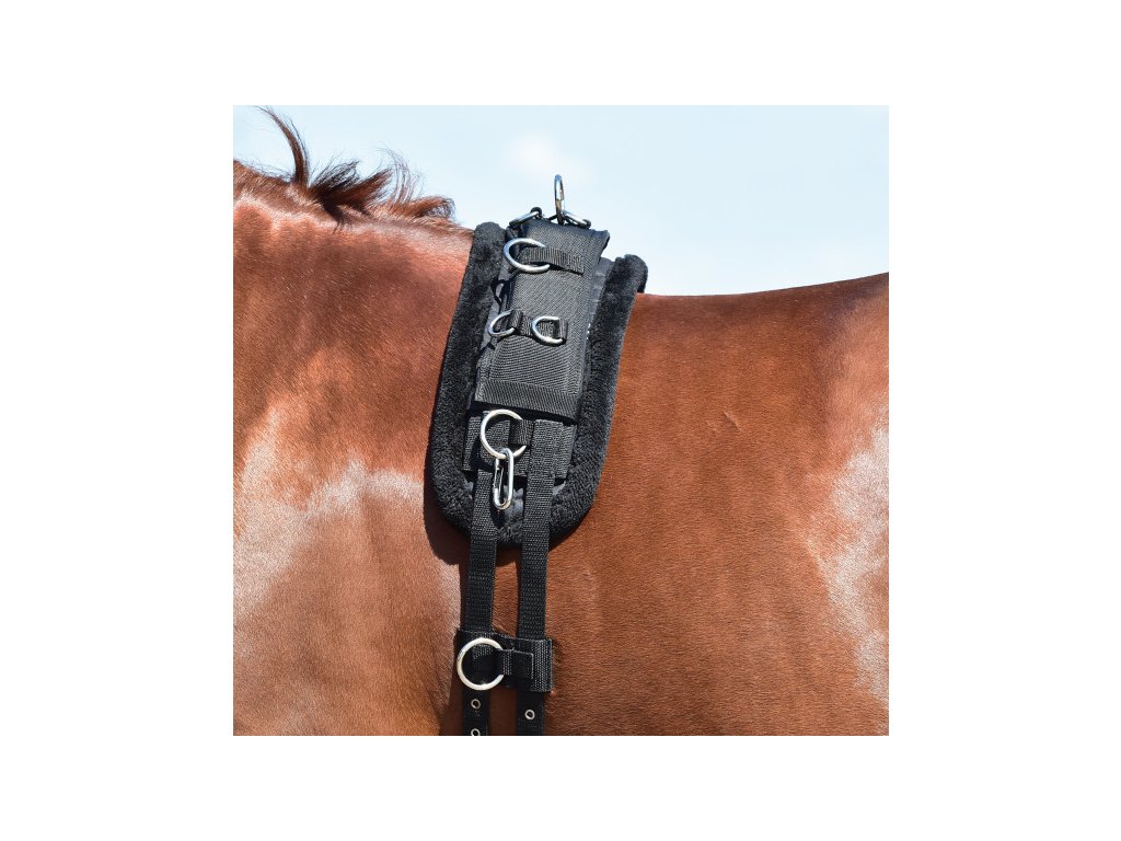 Dečka pod lonžovací obrušník, zdobená decentným prešívaním a vybavená barančekom z umelej kožušiny, ktorý je šetrný k pokožke. Na oboch stranách má suchý zips. Vrchný materiál je vyrobený z bavlny. Možno prať v práčke do 30 °C. Rozmery: 80 x 15 cm a 110 x 26 cm.