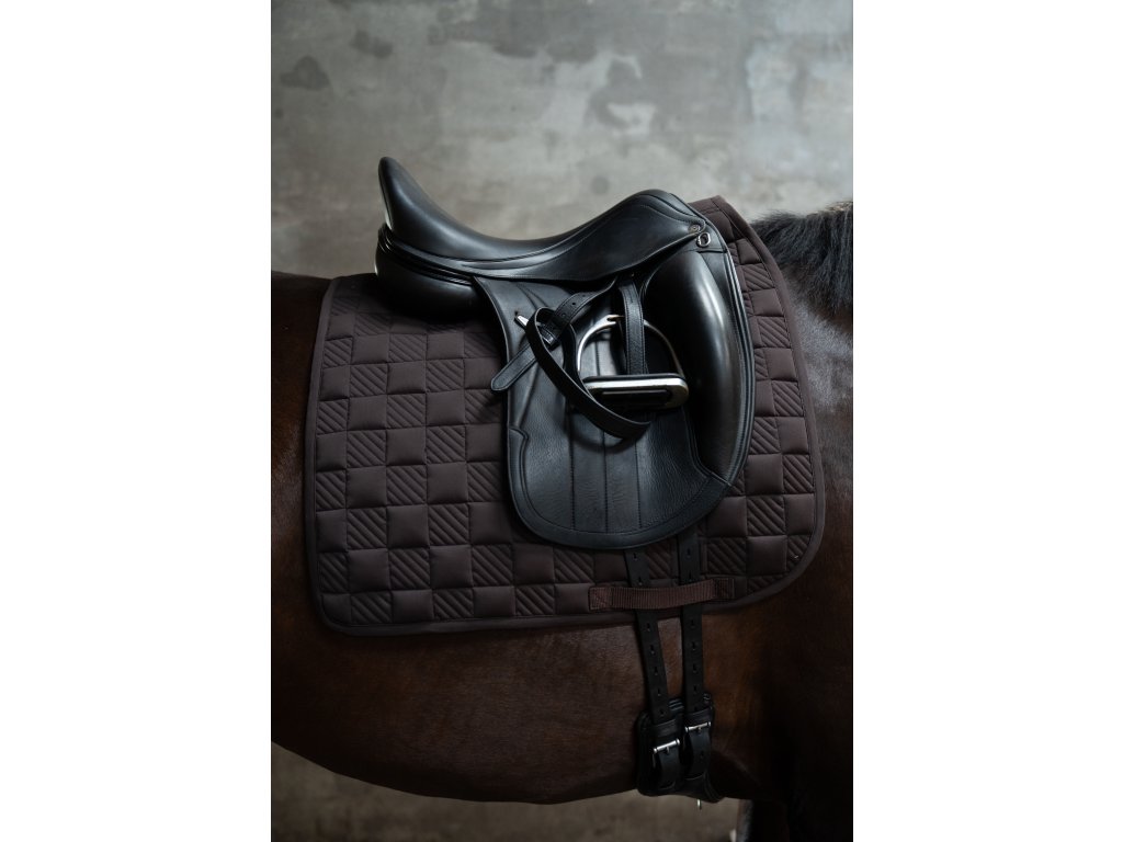 Kvalitná anatomicky tvarovaná podsedlová dečka s priedušnou sieťovinou na spodnej strane. Dečku zdobí 3D prešívanie v tvare štvorcov a vyšívané logo značky Lauria Garrelli. Vybavená je klasickými pútkami na suchý zips k sedlu a pútkami na podbrušník.