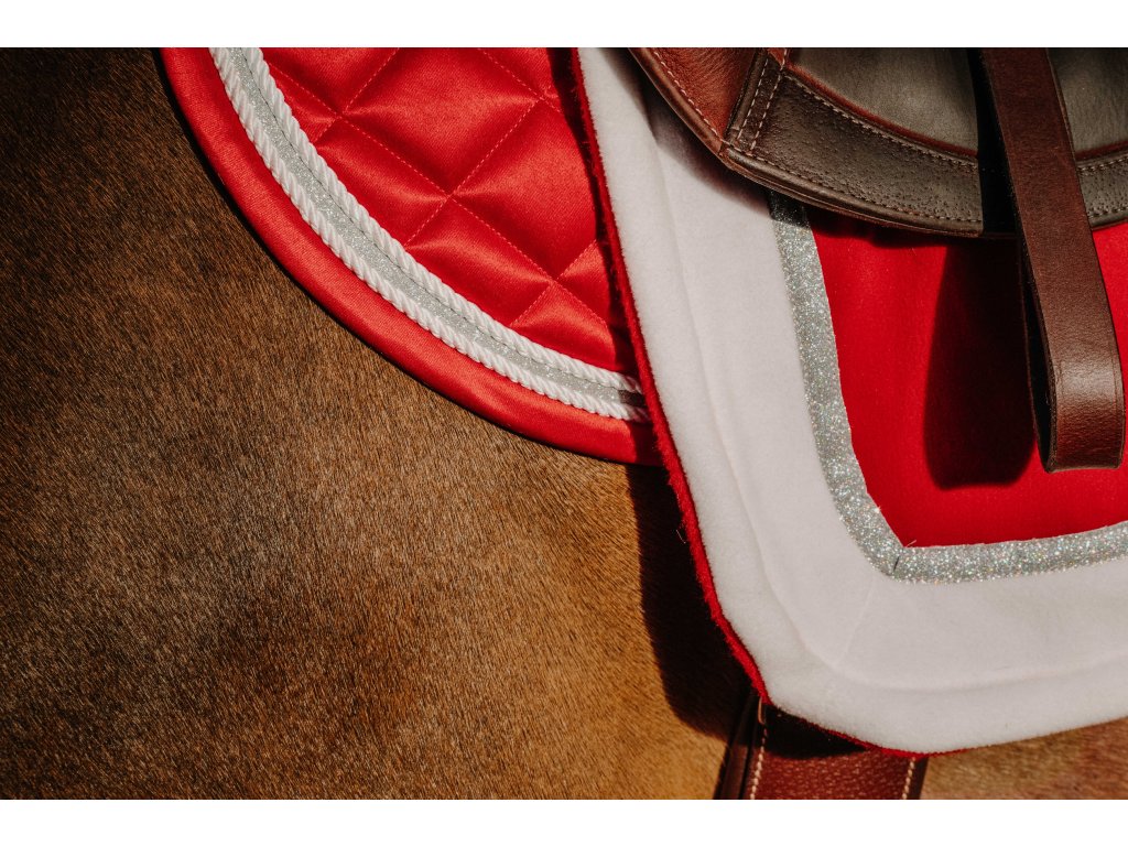Vylaďte vánoční outfit vašeho koně s vánoční podsedlovou dečkou. Tato dečka je vyrobena z výrazného červeného materiálu. Zdobena celoplošným prošíváním a stříbrnou paspulkou se třpytivým detailem. Má poutka na podbřišník.