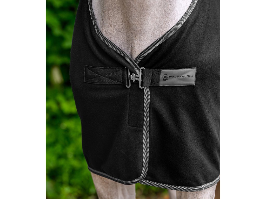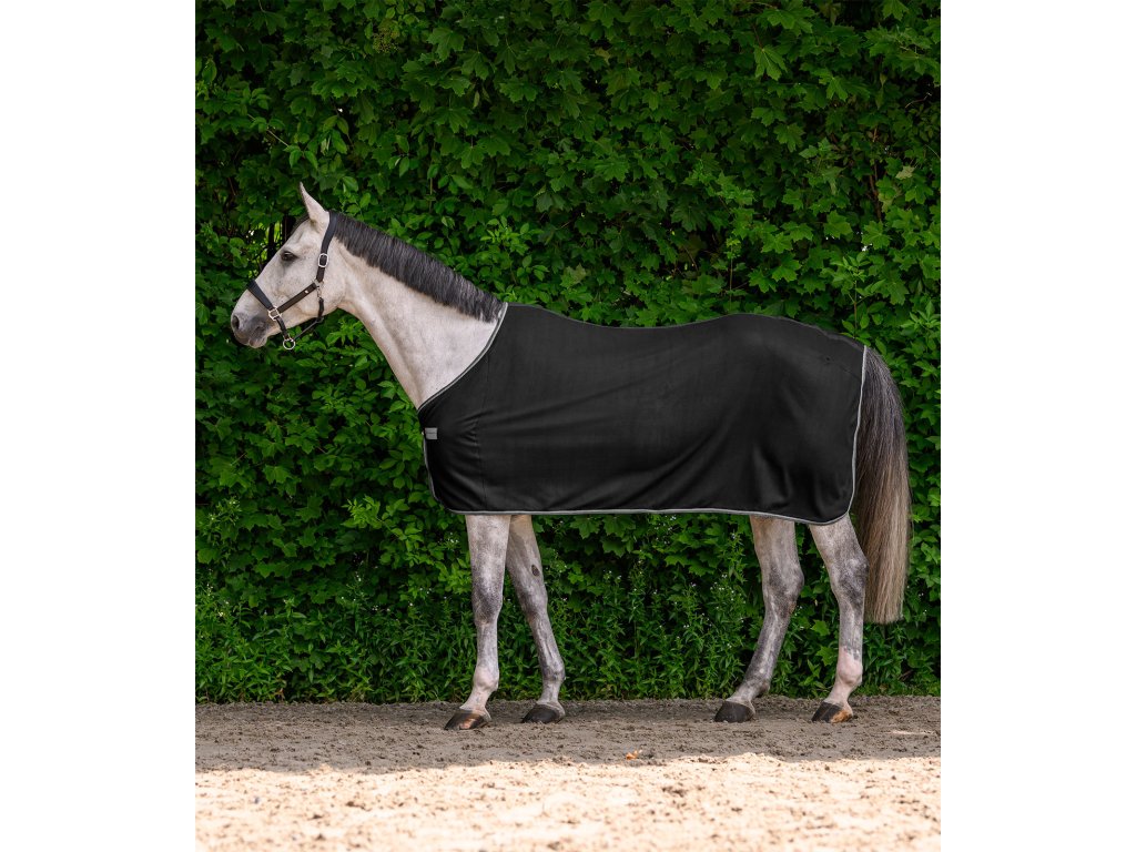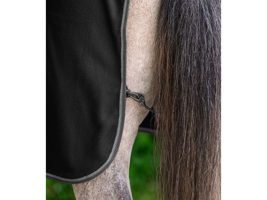 Klasická fleecová deka s jednoduchým predným zapínaním na T-pracku. Deka je vybavená popruhom pod chvost. Elegantný kontrastný lem dodáva deke štýlový vzhľad.