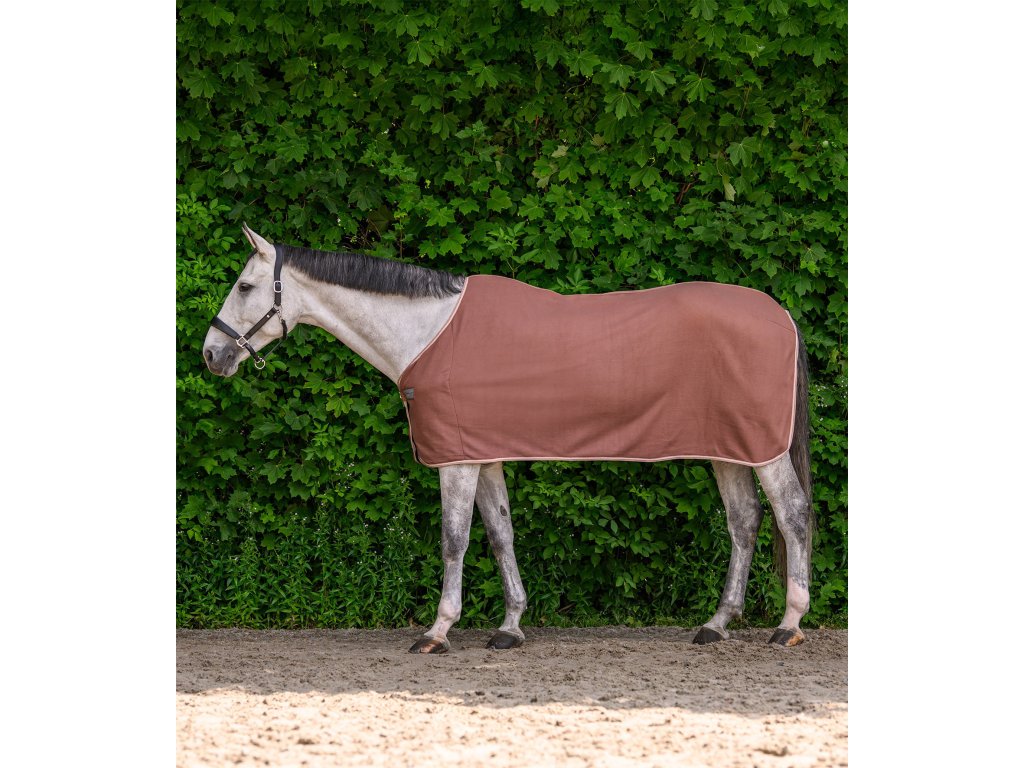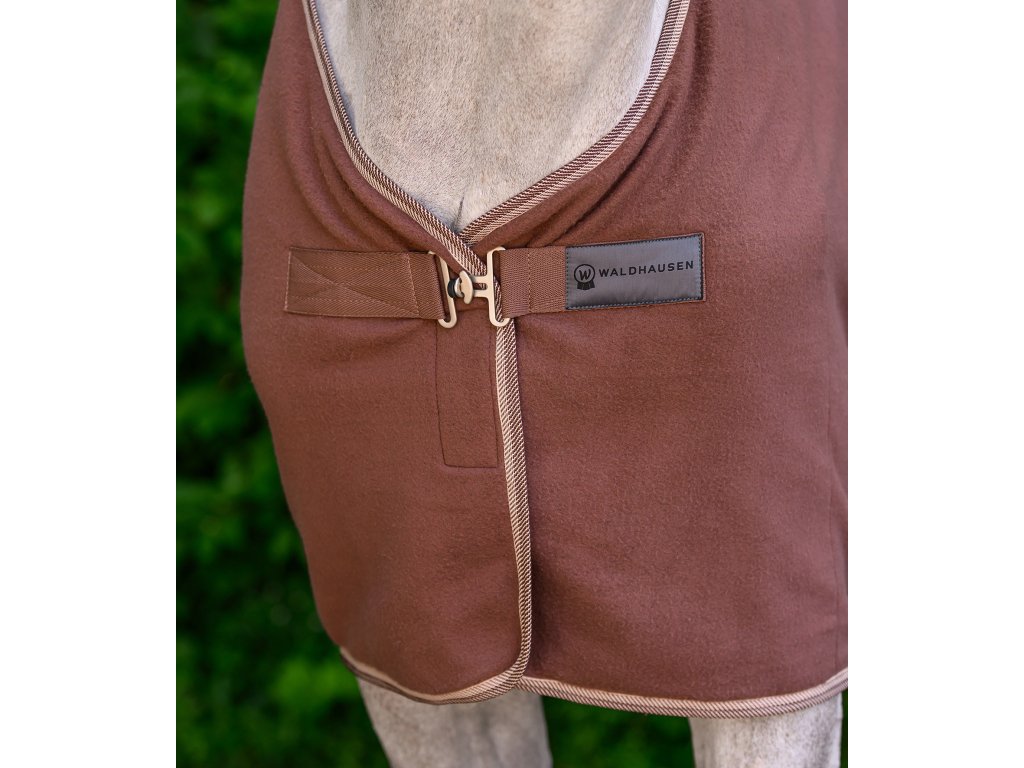 Klasická fleecová deka s jednoduchým predným zapínaním na T-pracku. Deka je vybavená popruhom pod chvost. Elegantný kontrastný lem dodáva deke štýlový vzhľad.