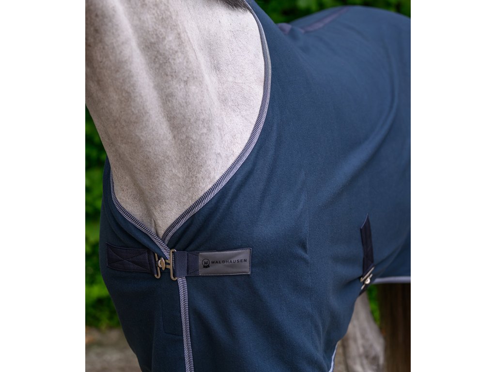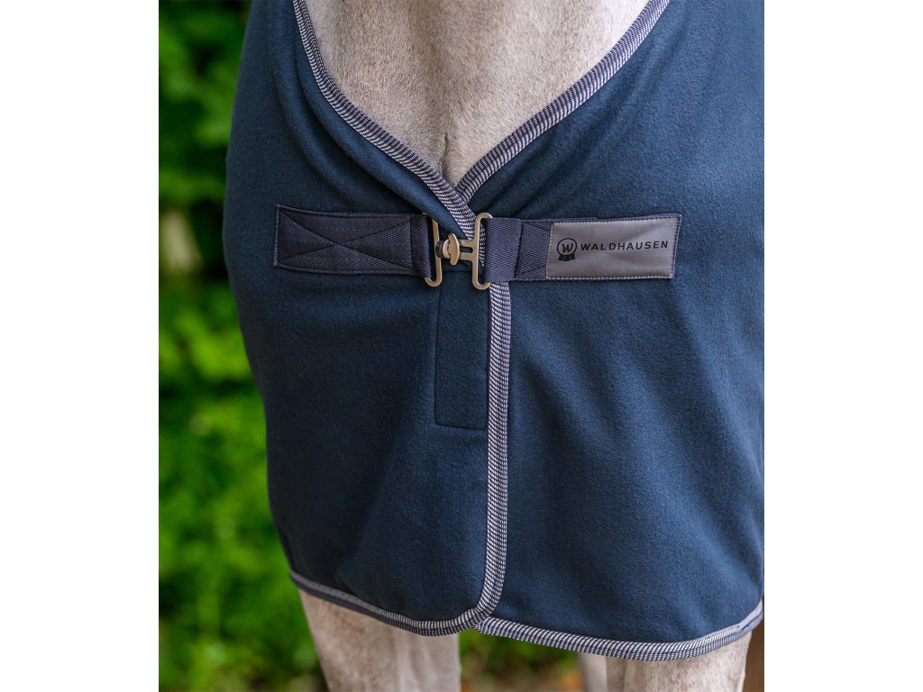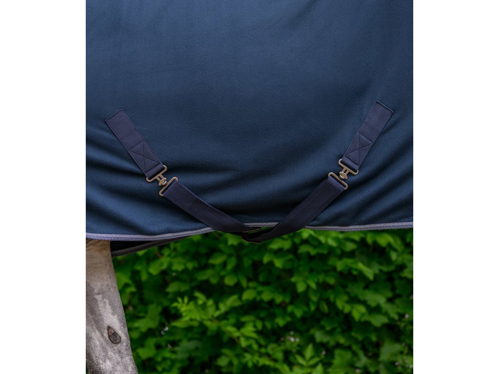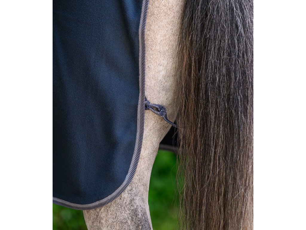 Klasická fleecová deka s jednoduchým predným zapínaním na T-pracku. Deka je vybavená krížovým zapínaním pod bruchom a popruhom pod chvost. Elegantný kontrastný lem dodáva deke štýlový vzhľad.