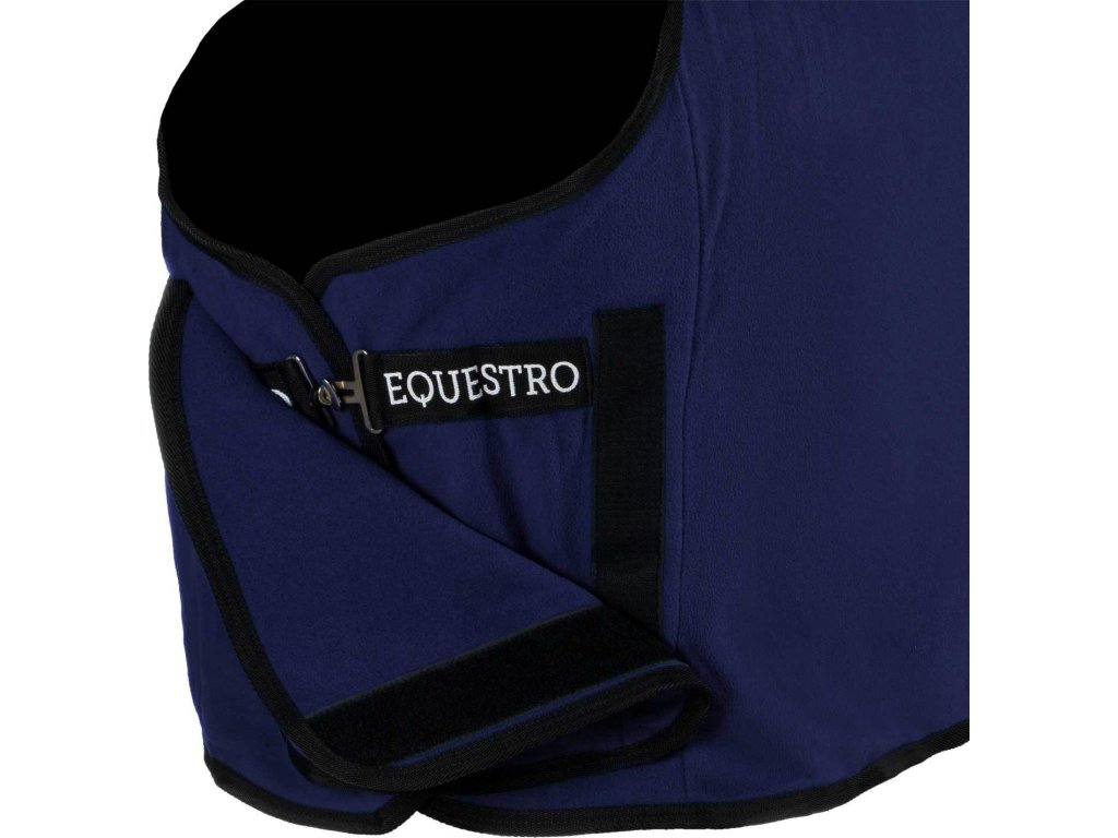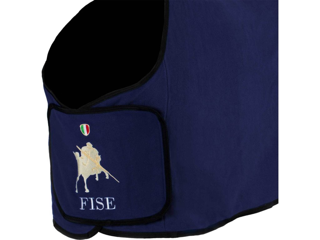 Fleecová deka Equestro X Fise je vyrobená z jemného, na dotyk veľmi príjemného fleecu s úpravou proti žmolkovaniu. Poskytuje koňovi maximálne pohodlie a hrejivosť, zatiaľ čo kvalitný materiál podporuje odparovanie vlhkosti, čím napomáha rýchlejšiemu schnutiu srsti. Deka má jednoduché predné zapínanie s klopou, ktoré zdobí výšivka loga Fise a mäkké syntetické polstrovanie v oblasti kohútika pre väčšie pohodlie a ochranu. Kontrastné lemovanie podčiarkuje elegantný vzhľad v štýle Equestro.