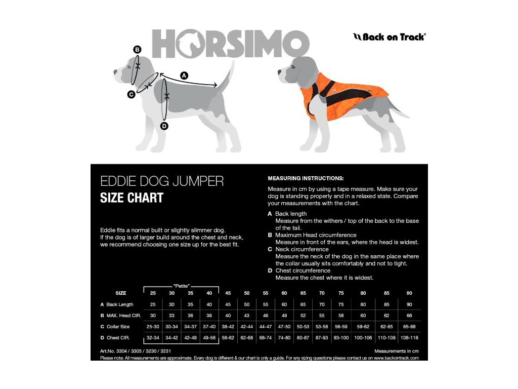 Ak chcete zistiť správnu veľkosť, zmerajte celkovú dĺžku chrbta od kohútika po koreň chvosta. Ak nameriate dĺžku, ktorá je medzi nimi, objednajte si o číslo väčšiu veľkosť.