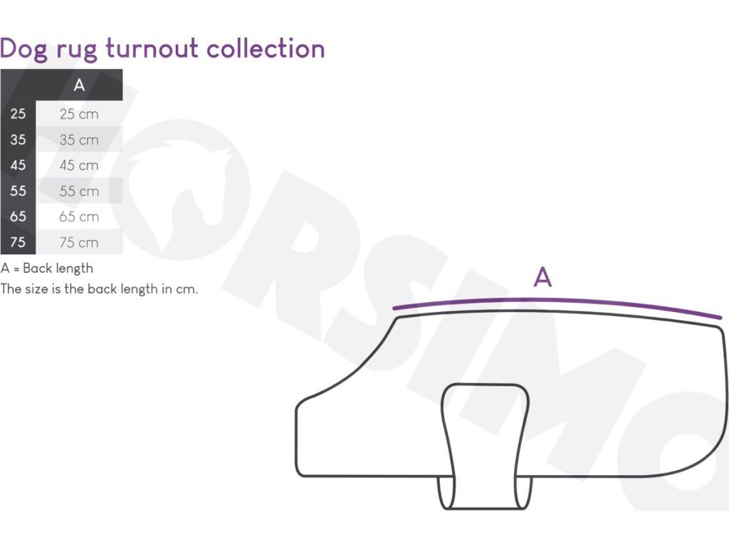 Ak chcete zistiť správnu veľkosť, zmerajte celkovú dĺžku chrbta od kohútika po koreň chvosta. Ak nameriate dĺžku, ktorá je medzi nimi, objednajte si o číslo väčšiu veľkosť. Uvedená veľkosť je horná (chrbtová) dĺžka deky.