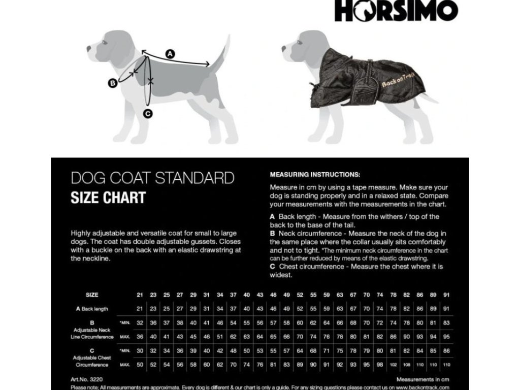 Ak chcete zistiť správnu veľkosť, zmerajte celkovú dĺžku chrbta od kohútika po koreň chvosta. Ak nameriate dĺžku, ktorá je medzi nimi, objednajte si o číslo väčšiu veľkosť. Medzi obrázkami nájdete tabuľku veľkostí.