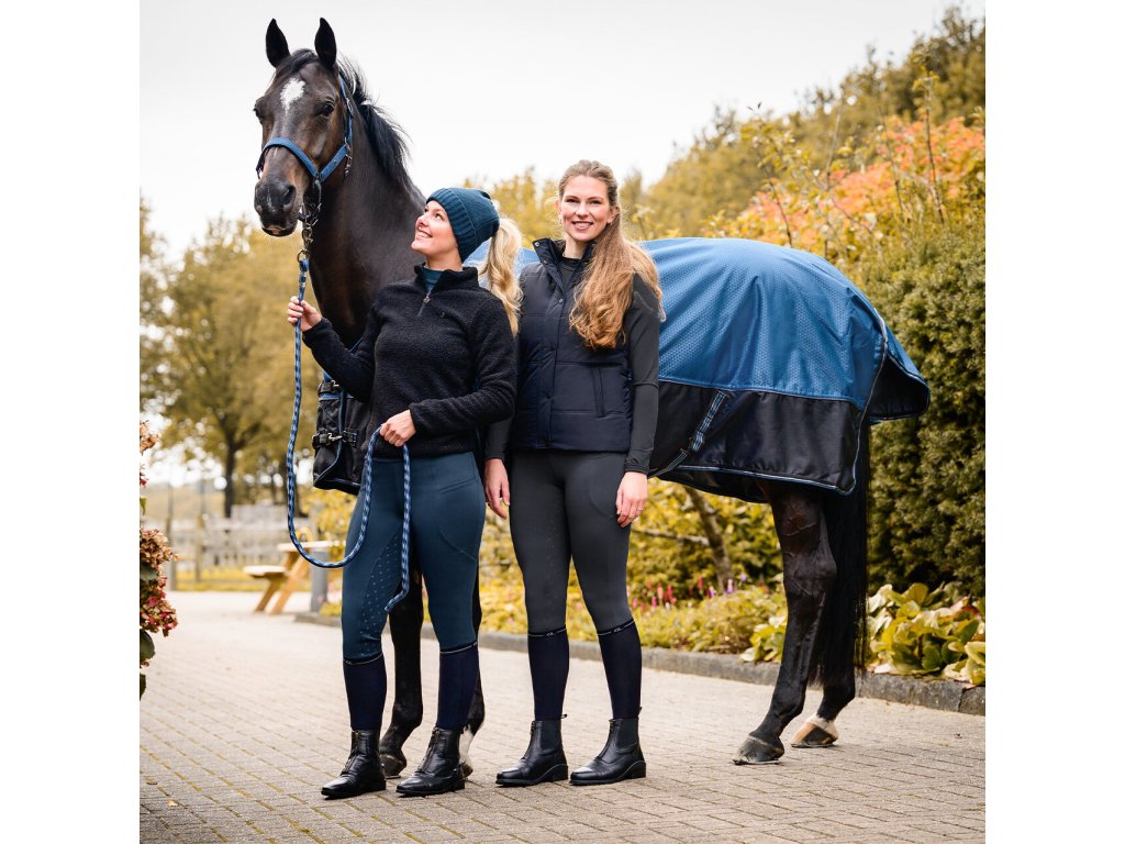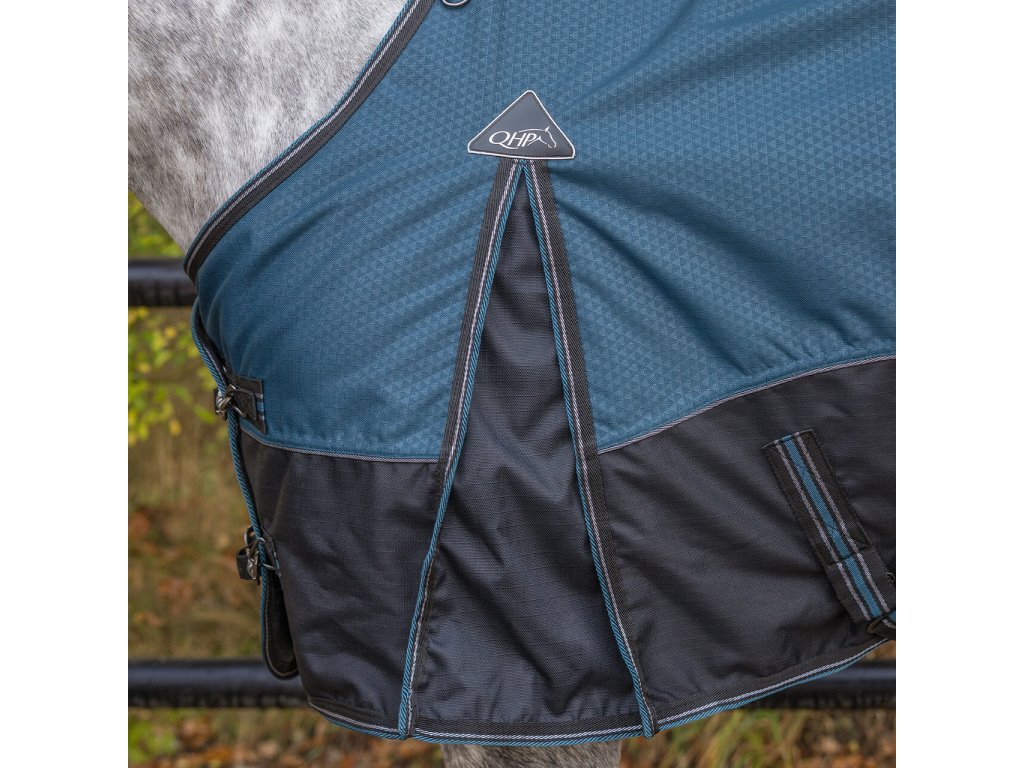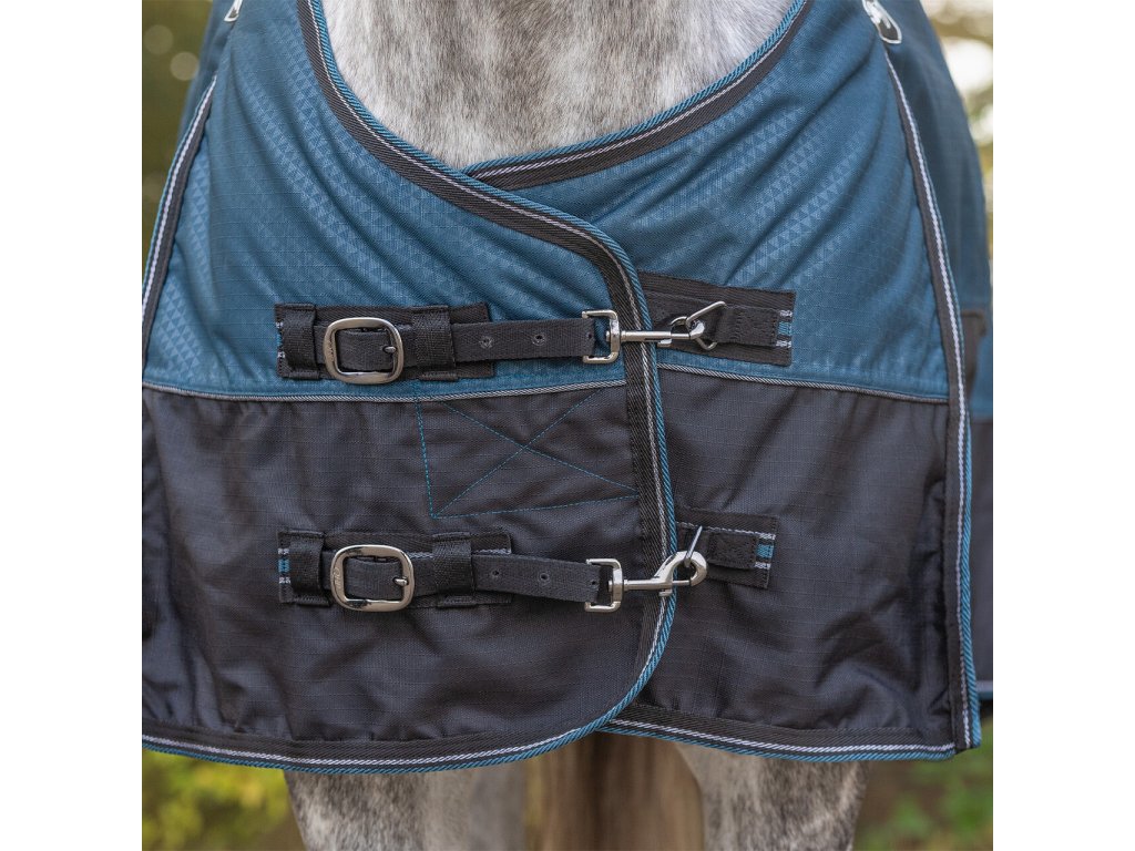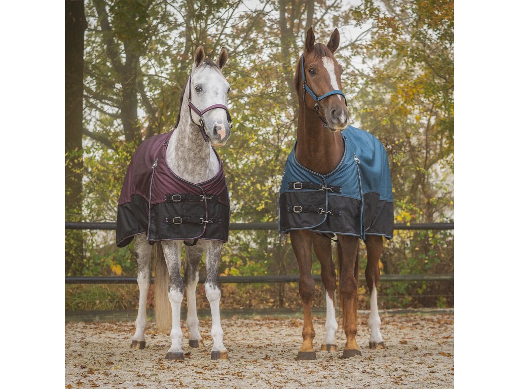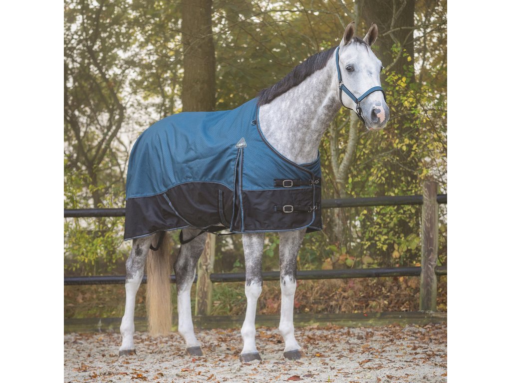 Veľmi kvalitná výbehová deka so zateplením 150 g. Je vyrobená z pevného, priedušného a nepremokavého materiálu s pevnosťou 1200 D a vodným stĺpcom 3000 mm/m², ktorý udržuje koňa v teple a suchu aj počas nepriaznivého počasia. Deka je vybavená dvojitým predným zapínaním, krížovým zapínaním pod bruchom s gumovými koncami, popruhmi medzi nohy a popruhom pod chvostom. Strih deky zahŕňa ramenné rozparky, mäkký fleece v oblasti kohútika a ochranu chvosta. V oblasti hrudníka je navyše nylonová vložka, ktorá zabraňuje odieraniu. Vďaka predĺženému strihu v oblasti hrudníka je deka vhodná aj pre širšie kone.