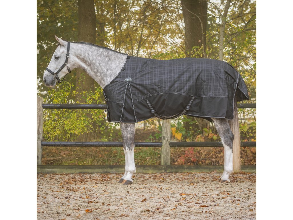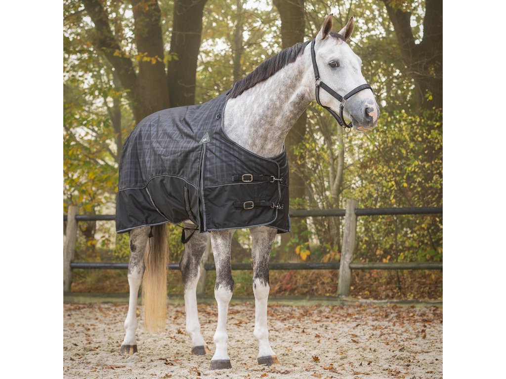 Veľmi kvalitná výbehová deka so zateplením 300 g. Je vyrobená z pevného, priedušného a nepremokavého materiálu s pevnosťou 1200 D a vodným stĺpcom 3000 mm/m², ktorý udržuje koňa v teple a suchu aj počas nepriaznivého počasia. Deka je vybavená dvojitým predným zapínaním, krížovým zapínaním pod bruchom s gumovými koncami, popruhmi medzi nohy a popruhom pod chvostom. Strih deky zahŕňa ramenné rozparky, mäkký fleece v oblasti kohútika a ochranu chvosta. V oblasti hrudníka je navyše nylonová vložka, ktorá zabraňuje odieraniu. Vďaka predĺženému strihu v oblasti hrudníka je deka vhodná aj pre širšie kone.