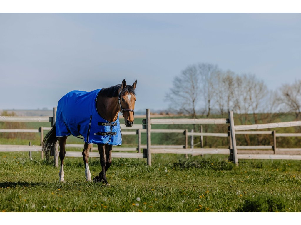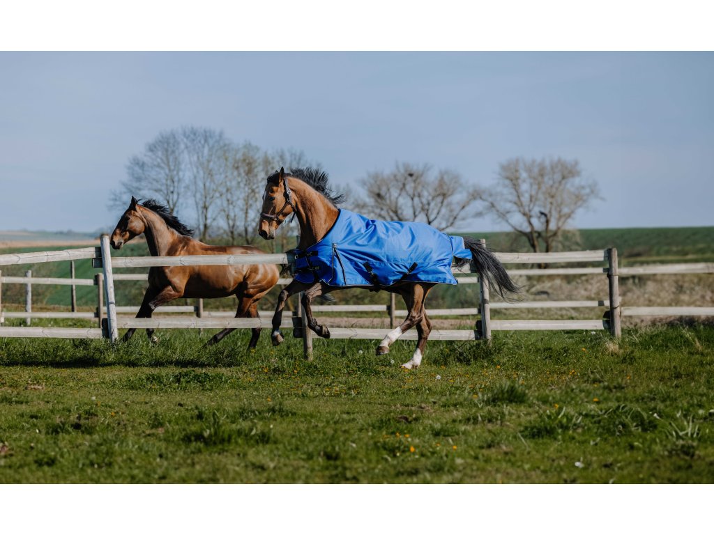 Táto nepremokavá výbehová deka so zateplením 150 g je vyrobená z mimoriadne odolného 1200 D polyesteru s podlepenými švami, ktoré zaisťujú vysokú odolnosť proti roztrhnutiu aj spoľahlivú ochranu pred dažďom a vetrom. Vnútornú stranu tvorí hladká nylonová podšívka, ktorá zaisťuje maximálne pohodlie pri nosení. Zadnú časť tvorí veľká klopa s reflexným pásikom, ktorý zvyšuje bezpečnosť koňa za šera. Vďaka pohodlným predným klinom, vnútornej podložke z umelého barančeka v oblasti kohútika a premyslenému strihu deka skvele sedí a nijako neobmedzuje v pohybe.