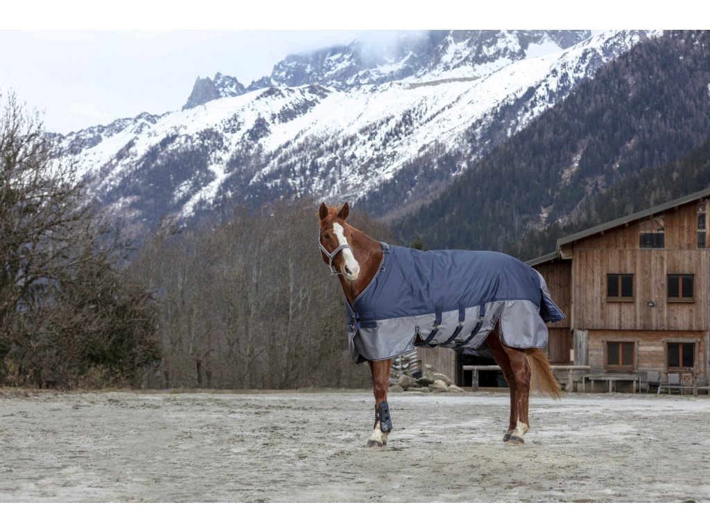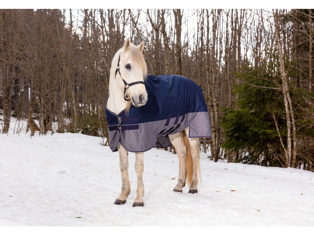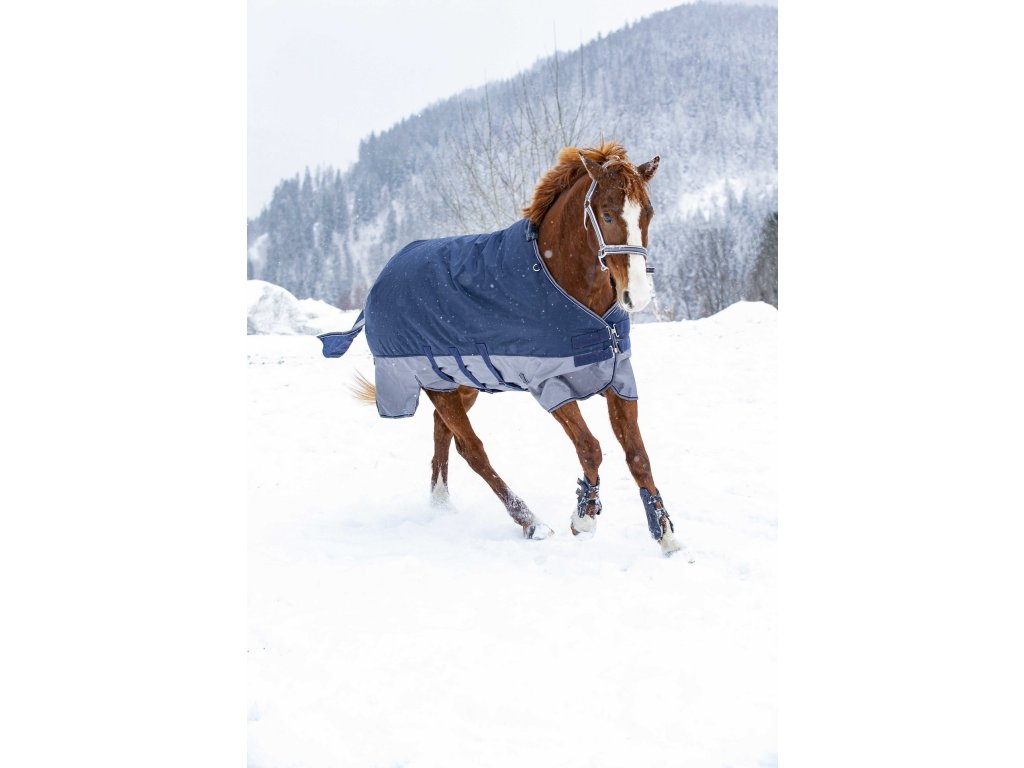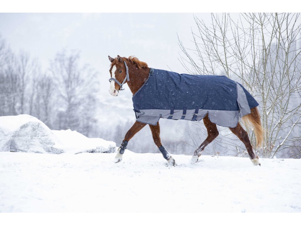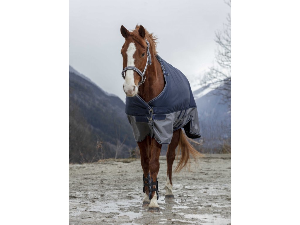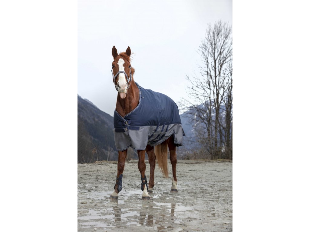 Táto nepremokavá výbehová deka so zateplením 300 g je vyrobená z vysoko odolného 600 D polyesteru, ktorý je odolný voči roztrhnutiu. Deka je doplnená podlepenými švami pre spoľahlivú ochranu pred vlhkosťou. Vnútornú stranu tvorí hladká nylonová podšívka, ktorá zaisťuje maximálne pohodlie pri nosení. Ochranu zvyšuje veľká nepremokavá chlopňa na chvost. V oblasti kohútika je deka vybavená mäkkým polstrovaním zo syntetického barančeka, ktoré zabraňuje odreniu a zvyšuje komfort. Deka má ochranu brucha a nastaviteľné popruhy medzi nohy, ktoré zaisťujú stabilné a bezpečné usadenie pri pohybe koňa.