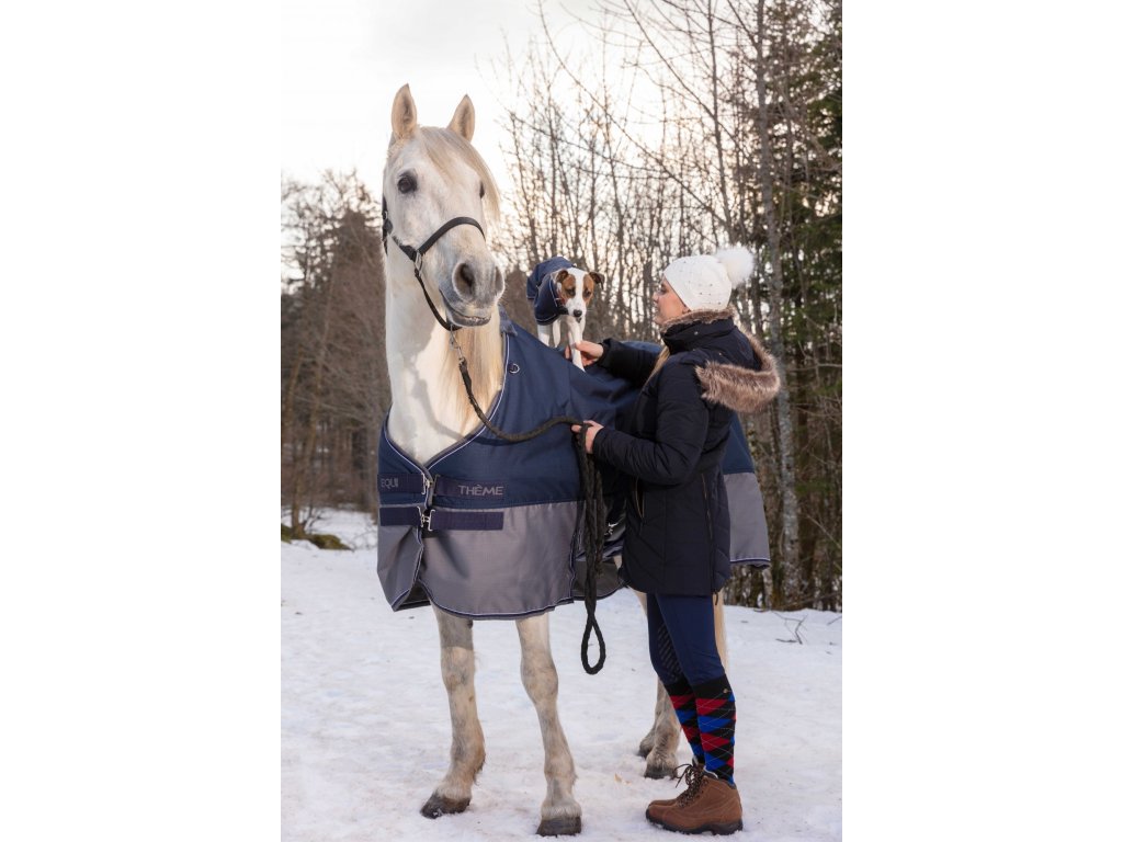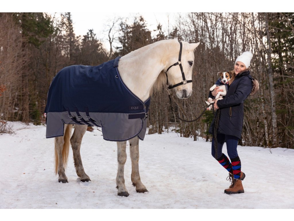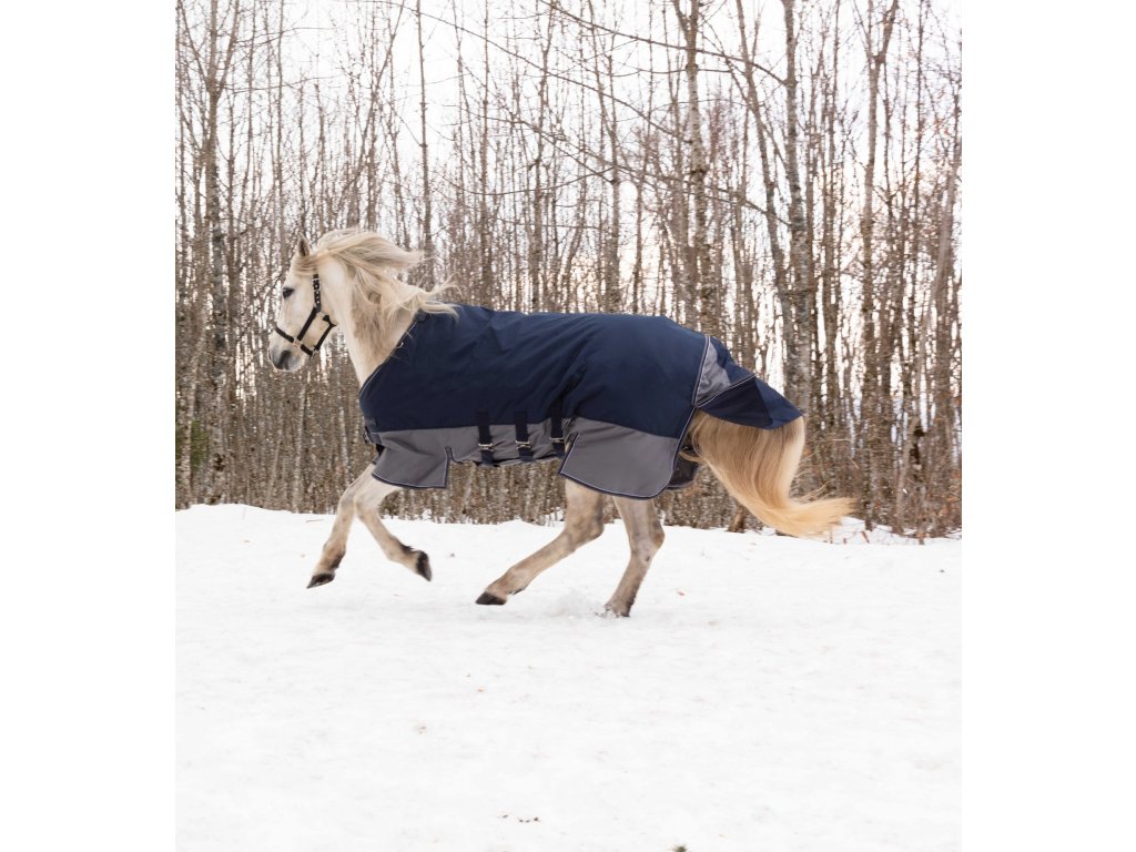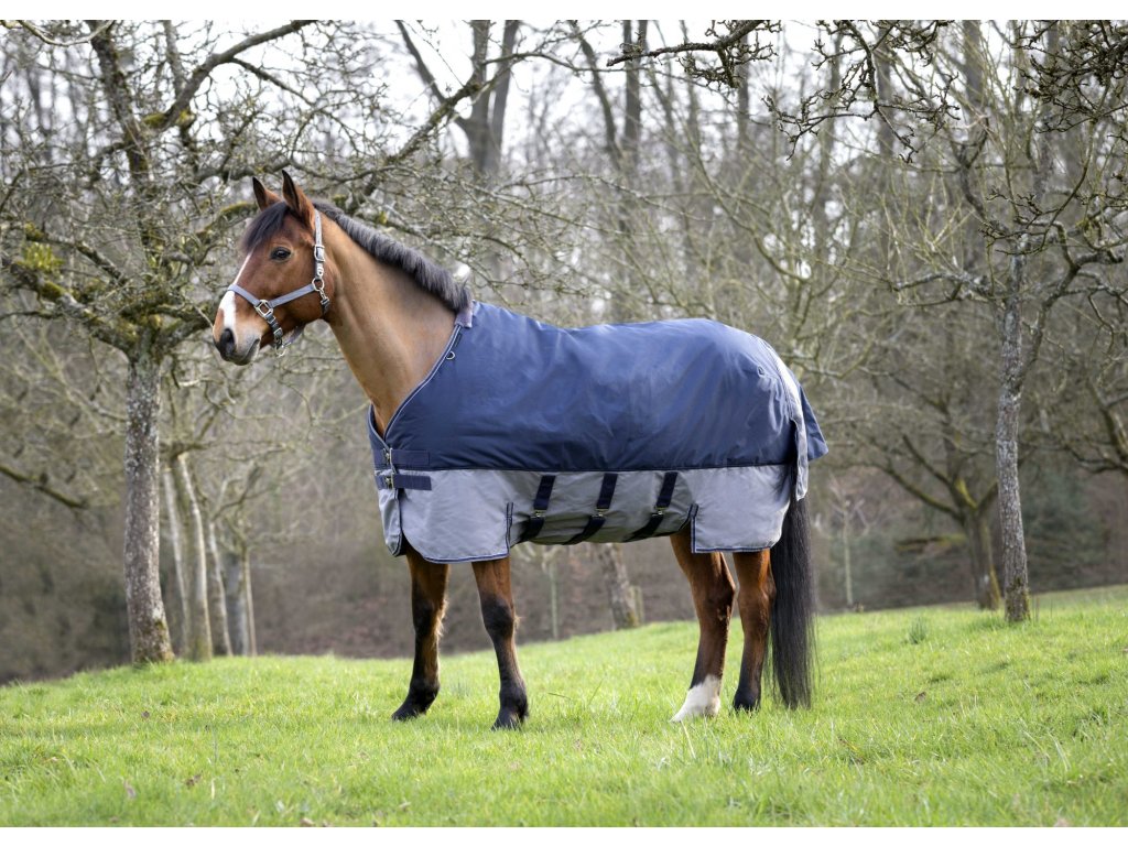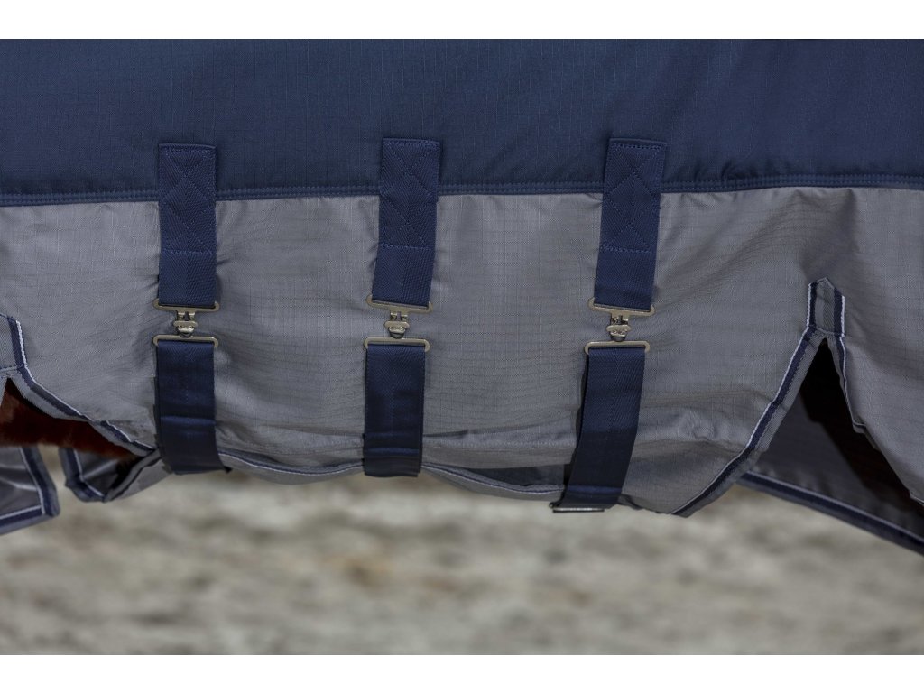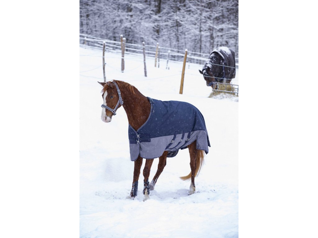 Táto nepremokavá výbehová deka so zateplením 300 g je vyrobená z vysoko odolného 600 D polyesteru, ktorý je odolný voči roztrhnutiu. Deka je doplnená podlepenými švami pre spoľahlivú ochranu pred vlhkosťou. Vnútornú stranu tvorí hladká nylonová podšívka, ktorá zaisťuje maximálne pohodlie pri nosení. Ochranu zvyšuje veľká nepremokavá chlopňa na chvost. V oblasti kohútika je deka vybavená mäkkým polstrovaním zo syntetického barančeka, ktoré zabraňuje odreniu a zvyšuje komfort. Deka má ochranu brucha a nastaviteľné popruhy medzi nohy, ktoré zaisťujú stabilné a bezpečné usadenie pri pohybe koňa.