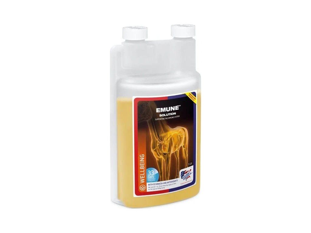 Doplnok pre kone Emun podporuje imunitný systém, keď je to najviac potrebné. V náročných obdobiach, ako je zima alebo jar, pri zdravotných problémoch a na urýchlenie rekonvalescencie po zraneniach. Emune Solution je chutný tekutý prípravok , ktorý sa môže podľa potreby primiešať do krmiva alebo aplikovať striekačkou priamo do huby. Obsahuje extrakt z echinacey, u ktorej bolo preukázané, že podporuje červené aj biele krvinky, a tiež Astragalus, koreň rastliny, o ktorej sa predpokladá, že pomáha posilňovať a regulovať imunitný systém. Antioxidanty vitamíny C a E tiež podporujú imunitnú funkciu, rovnako ako rastlinné antioxidanty čučoriedky a kurkuma. Nukleotidy získané z kvasiniek pomáhajú podporovať črevný imunitný systém, ktorý sa čoraz viac považuje za dôležitý pre udržanie zdravia a duševnej pohody. Emune Solution je tiež vhodný pre žriebätá, ktoré potrebujú dodatočnú imunitnú podporu, a mal by byť podávaný v primeranej zníženej dávke založenej na telesnej hmotnosti. Balenie 1 l vystačí na 30 dní. Tento produkt nie je doping.