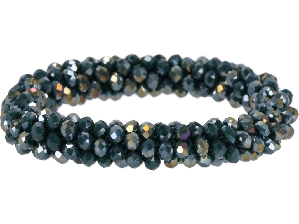 Stylová gumička do vlasů je navlečená na pevné pružné gumě a zdobená hranatými korálky s jemným třpytem, které dodávají elegantní vzhled. Díky kvalitnímu zpracování dobře drží ve vlasech a zároveň netahá. Gumičku lze nosit nejen ve vlasech, ale také jako náramek, takže se stává praktickým i módním doplňkem pro každodenní nošení.