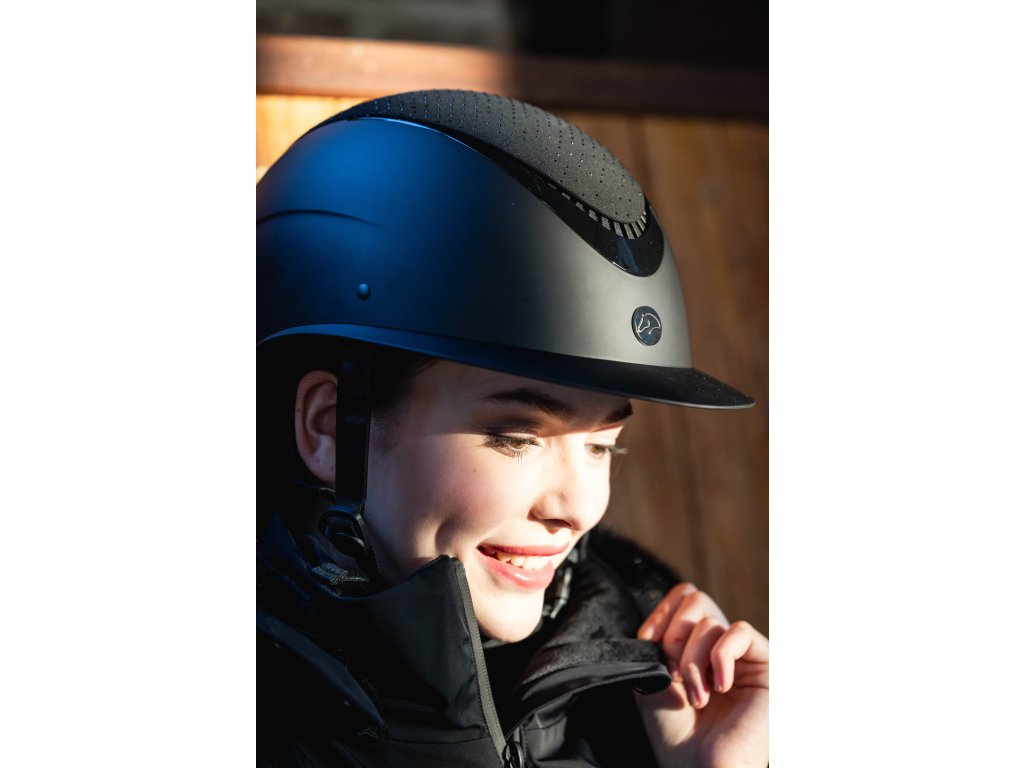 Bezpečnostná jazdecká prilba v elegantnom dizajne s trblietavými kamienkami. Vybavená priedušnou podšívkou z polyesterového materiálu, mäkkou ochranou brady a bezpečnostným zapínaním. Vybavená je ventilačnými otvormi pre maximálne pohodlie. Nastavenie veľkosti je možné pomocou otočného kolieska. Spĺňa európsku normu EN 1384: 2023.