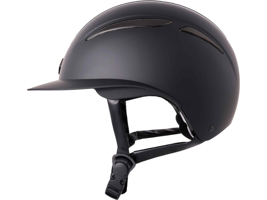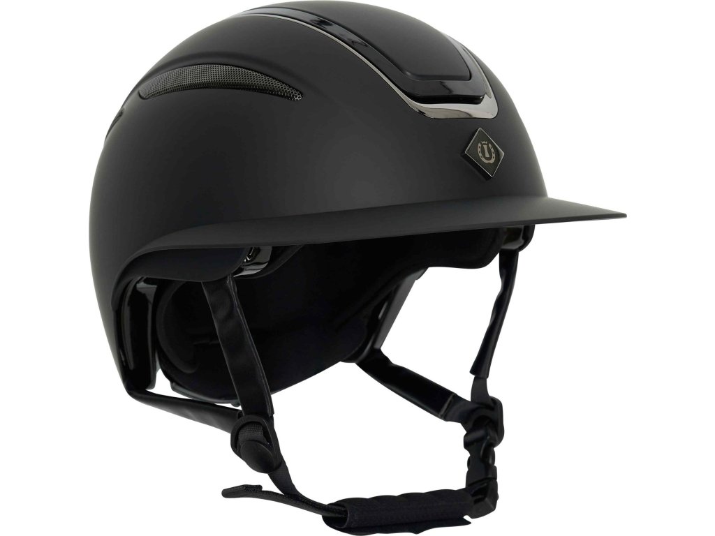 Elegantná jazdecká prilba so širokým šiltom vhodná pre všetkých, ktorí chcú jazdiť štýlovo a bezpečne. Zdobená lesklými detailmi. Prilba je vybavená vetracími otvormi, ktoré zaisťujú cirkuláciu vzduchu, chrómovanými plastovými lemami a odolnou škrupinou z materiálu ABS pre spoľahlivú ochranu. V zadnej časti je vybavená sťahovacím kolieskom, vďaka ktorému si veľkosť upravíte presne podľa vašej potreby. Spĺňa bezpečnostné normy VG1 01.040 2014-12 a EN 1384:2023, takže je vhodná na športové aj rekreačné jazdenie.