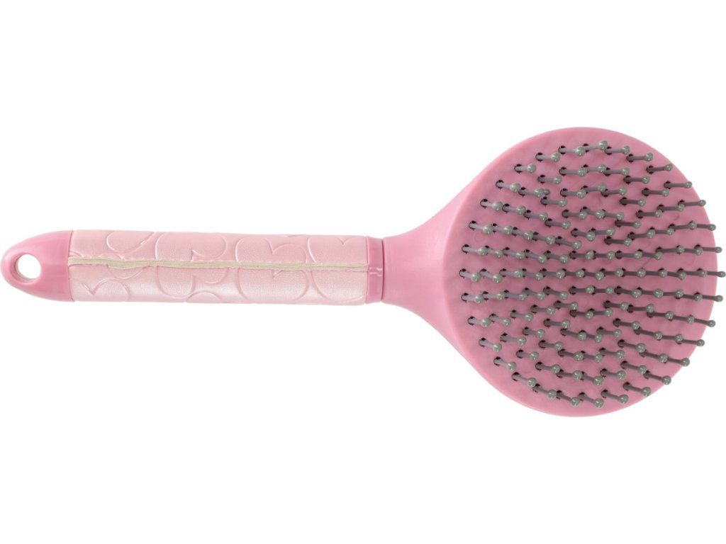 Odolná kefa na hrivu a chvost s roztomilým motívom srdiečok na rukoväti. Hrubé plastové štetiny ľahko rozčešú zamotanú hrivu aj chvost a zaistia rýchlu a pohodlnú úpravu.