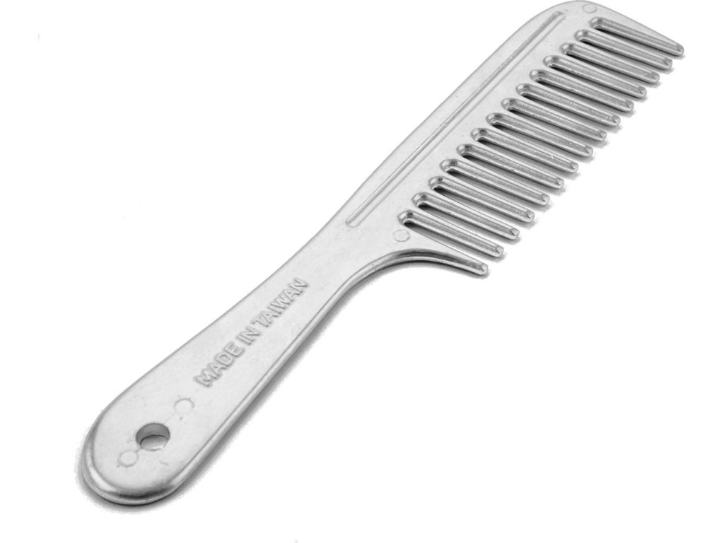 Hliníkový hrebeň na úpravu hrivy a chvosta od značky Umbria Equitazione. V rukoväti je otvor na prevlečenie, napríklad šnúrky na zavesenie.