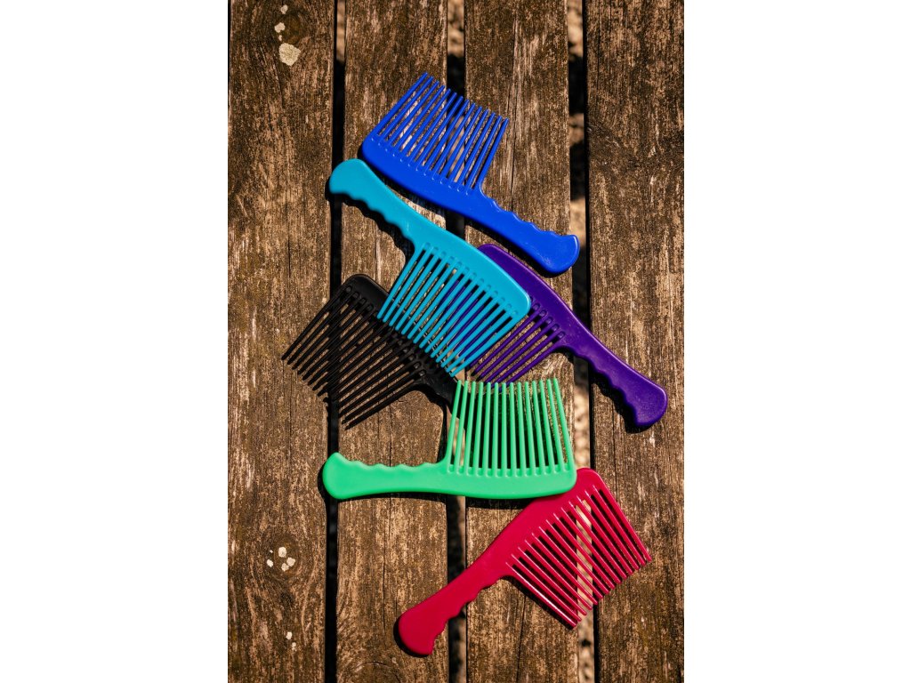 Hrebeň s dlhými zubami je ideálny na efektívne vyčesávanie hrivy a chvosta. Vďaka dlhým zubom ľahko preniká aj do hustej srsti, zatiaľ čo zaoblené špičky chránia pokožku pred podráždením a poškodením. Rukoväť zaisťuje pohodlné a pevné uchopenie, čo uľahčuje každodennú starostlivosť o srsť.