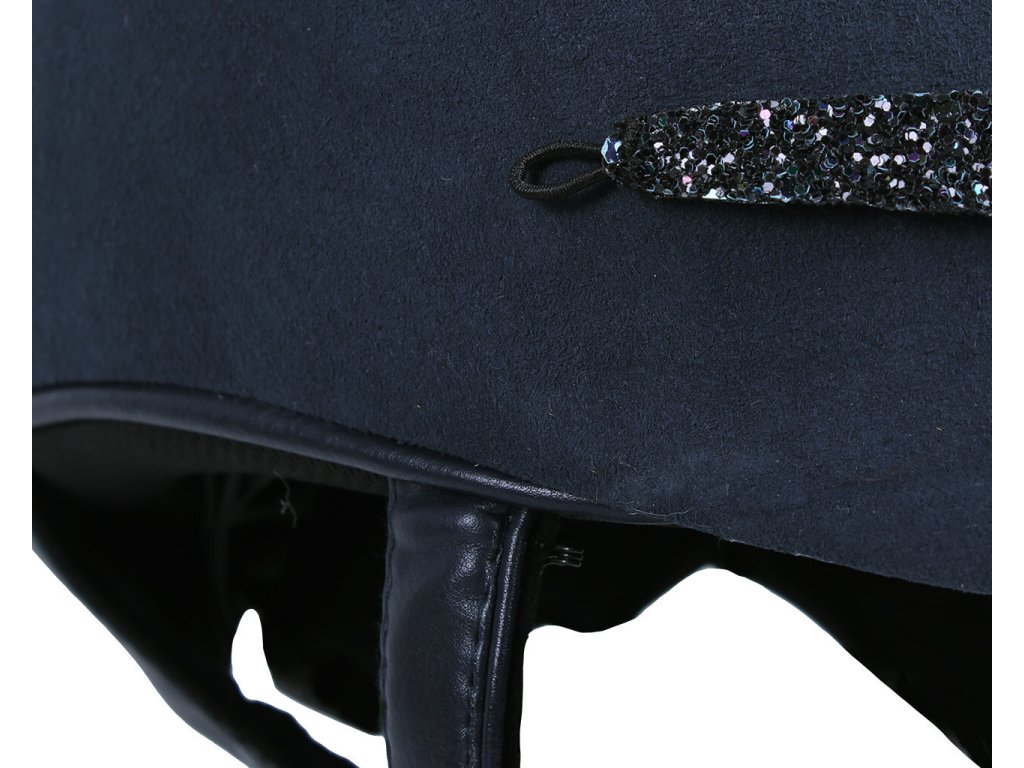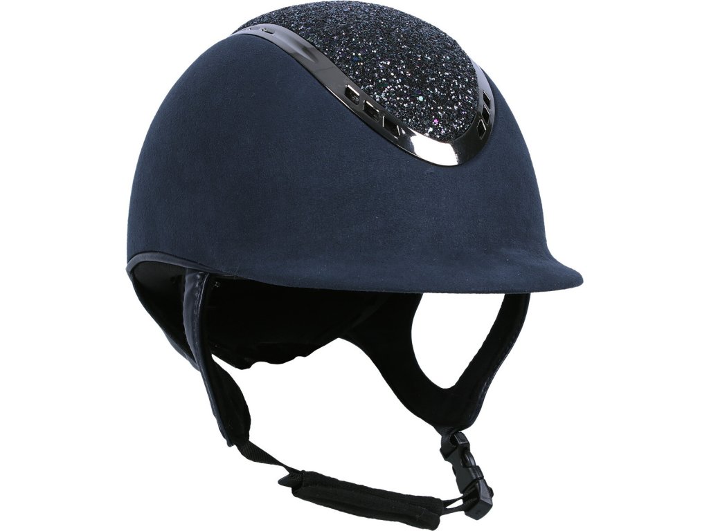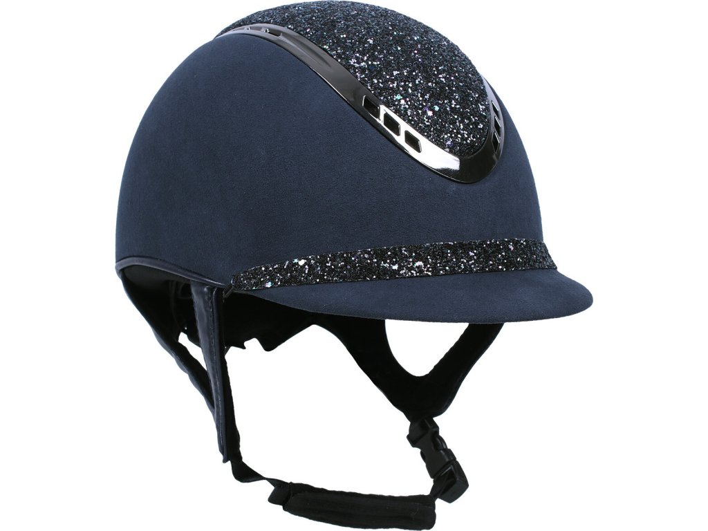 Bezpečnostná jazdecká prilba vyrobená z priedušného polyesterového materiálu. S elegantným vzhľadom, zdobená trblietkami. Vzhľad prilby možno ľahko zmeniť pomocou odnímateľného popruhu. Vybavená podšívkou z umelej kože. Podšívku možno prať v práčke a možno ju ľahko pripevniť k prilbe pomocou suchého zipsu. S nastaviteľným pásom na brade. Dodáva sa s dvoma vložkami pre okrúhly a oválny tvar hlavy. Vyrobená podľa štandardu VG1 01.040 2014-12.