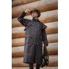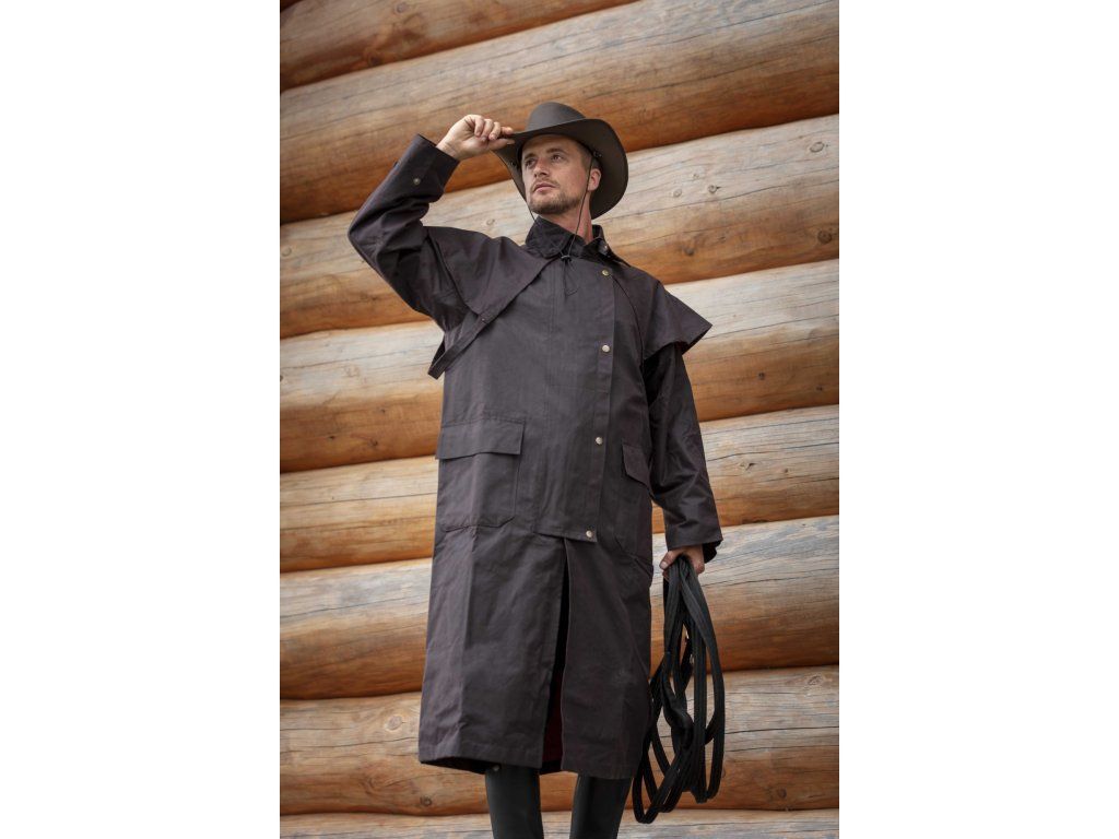 Originálny dlhý austrálsky kabát, ktorý vás udrží v suchu po celý deň. Kabát je vyrobený z voskovanej bavlny, podšitý hrejivou bavlnenou podšívkou a vybavený príjemným golierom z manšestrového materiálu. Má dve veľké vonkajšie vrecká a jedno vnútorné. Praktický rozparok poskytuje pohodlie pri jazde a kabát si môžete upevniť okolo stehien pomocou elastických popruhov. Zapínanie na zips s gombíkmi.