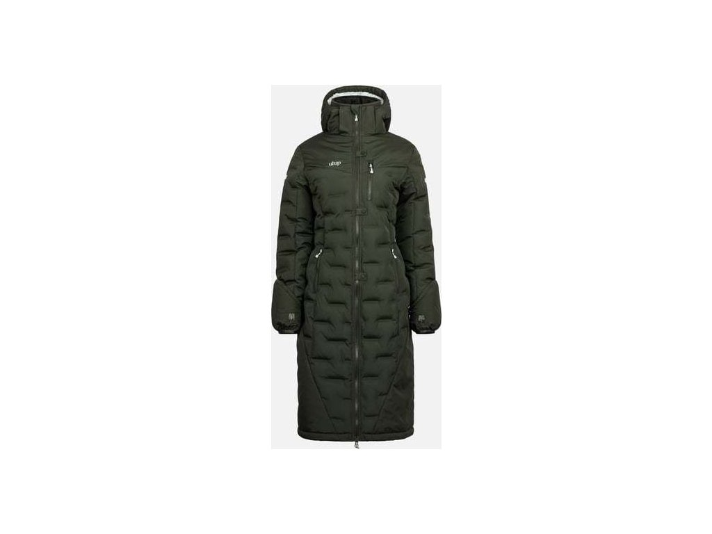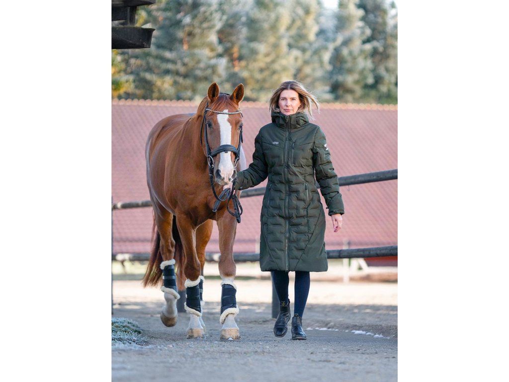 Veľmi teplý zimný kabát od švédskeho výrobcu UHIP. Ice kabát je ideálnou voľbou, ak trávite veľa času vonku a potrebujete outdoorové oblečenie, ktoré zahreje a zároveň ochráni pred dažďom. Tento kabát je výbornou voľbou na zimu nielen do sedla, stajne, ale aj do mesta. Dĺžka kabátu siaha po kolená a športový strih je prispôsobený ženským krivkám. Jeho široká škála funkcií bola riadne otestovaná, a preto je každý deň v stajni oveľa jednoduchší a príjemnejší. Vysoký rozparok v zadnej aj prednej časti zaisťuje slobodu v pohybe pri jazdení. Kabát je vybavený obojsmerným predným zipsom a praktickými vreckami. Ďalej vysokým útulným golierom, odnímateľnou kapucňou a rukávmi, ktoré môžu slúžiť ako rukavice a možno ich vyhrnúť podľa potreby. Kabát si môžete upevniť okolo stehien pomocou elastických popruhov.