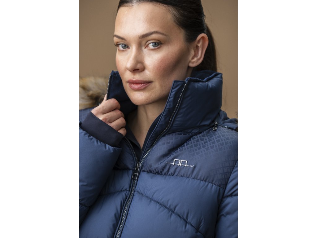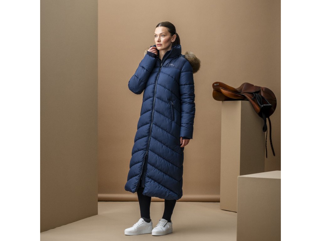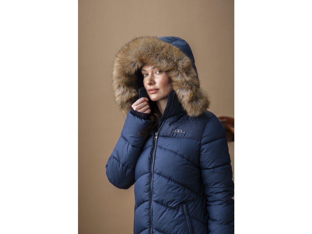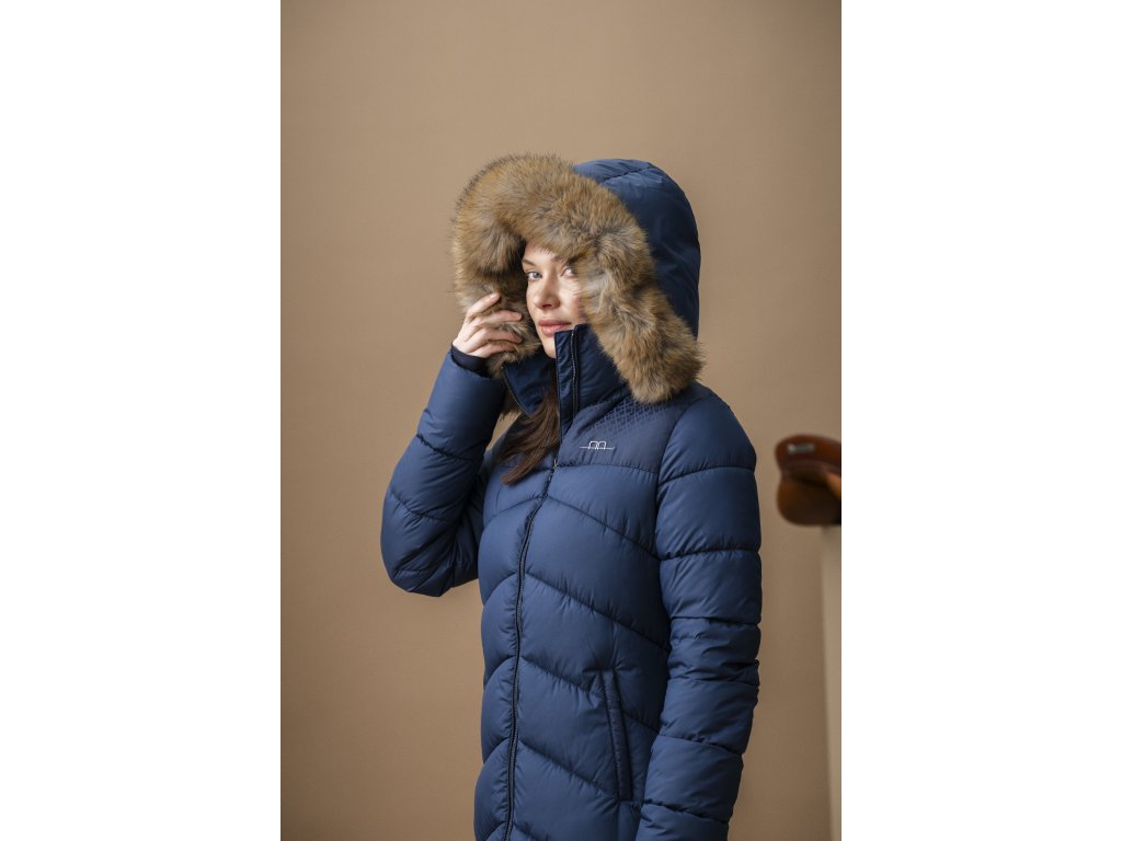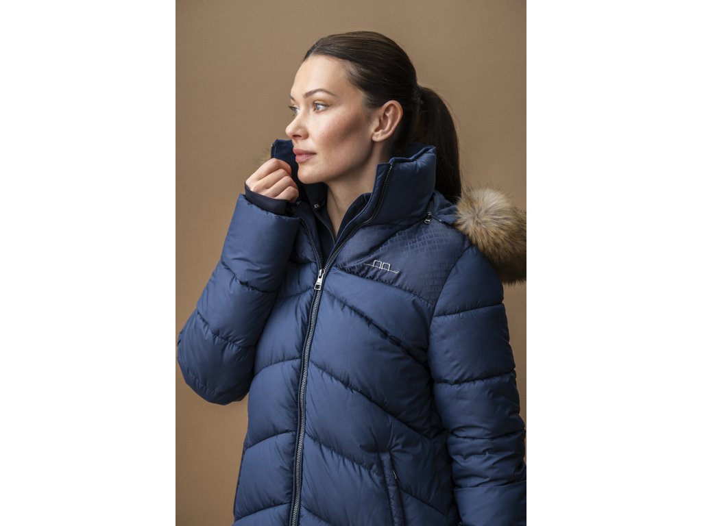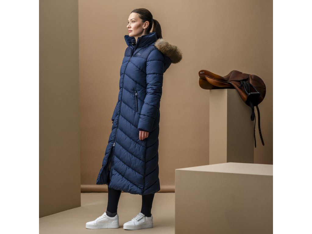 Dámský zimný jazdecký kabát Nivia je navrhnutý tak, aby spoľahlivo zahrial pri jazde aj práci v stajni. Pevný vonkajší ripstop materiál s povrchovou úpravou chráni pred vodou, vetrom, UV žiarením aj nečistotami a zabezpečuje dlhú životnosť a každodenný komfort. Výplň je z recyklovanej 3M™ Thinsulate™ Featherless izolácie, ktorá poskytuje vysokú hrejivosť bez zbytočného objemu. Kabát ponúka dve vonkajšie vrecká na zips, jedno vnútorné vrecko na zips a štýlové panely z nylonového materiálu s logom výrobcu, ktoré dodávajú elegantný vzhľad. Kapucňa aj kožušina sú odnímateľné. Zamatová podšívka goliera zaisťuje mimoriadne príjemný pocit pri nosení.