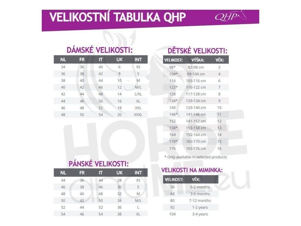 QHP je holandská značka výrobkov pre kone a jazdcov so zameraním na kvalitu, originálny dizajn a funkčnosť. QHP ponúka široký sortiment stálych produktov vo výrazných farbách a originálne pestrofarebné sezónne kolekcie. Vyniká najmä perfektnými vysokými jazdeckými čižmami v špičkovej kvalite za rozumnú cenu, veľkým výberom krásnych uzdečiek a najväčšou ponukou veľkostí kvalitných diek pre kone.