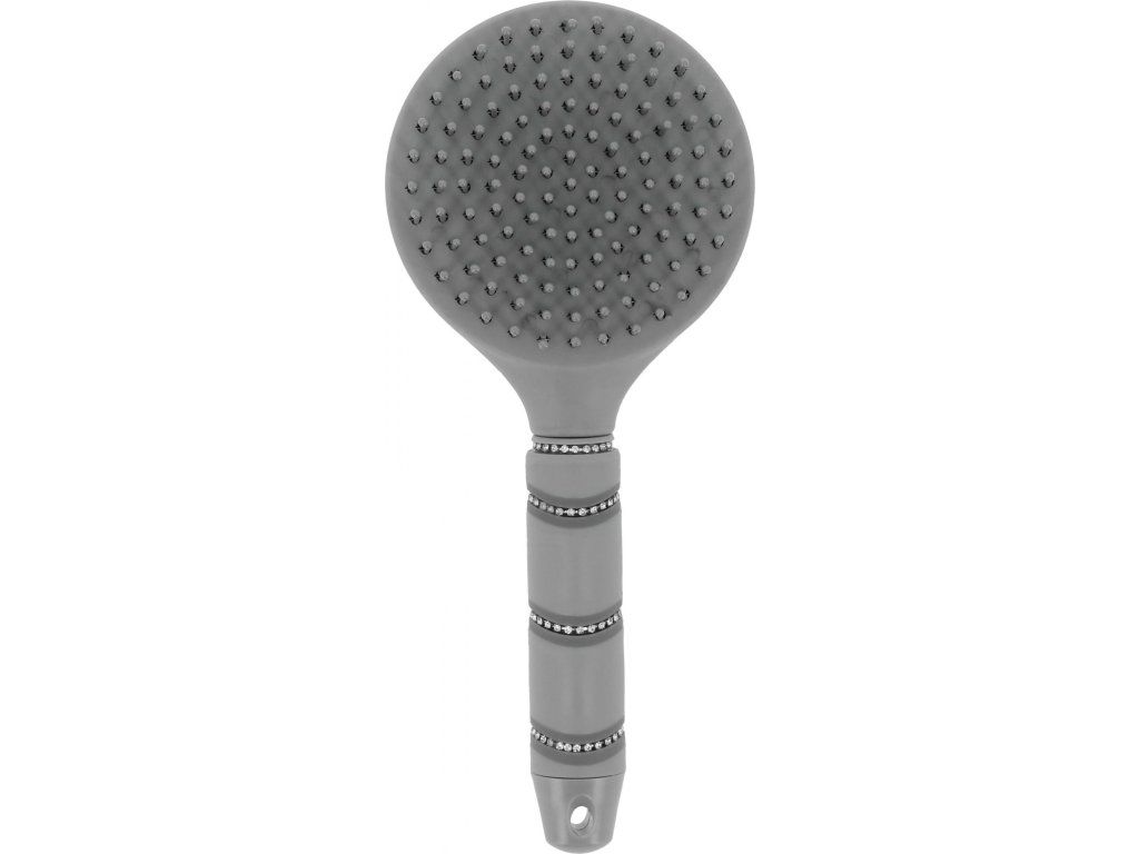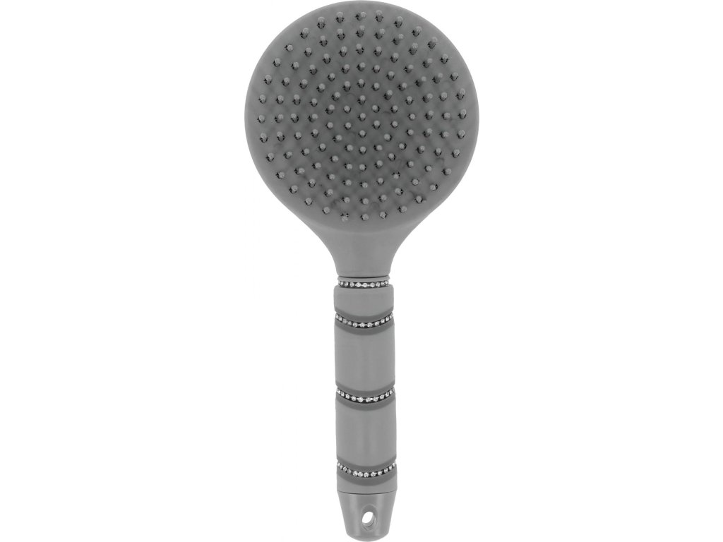 Elegantná kefa na konskú hrivu spája funkčnosť s atraktívnym vzhľadom. Mäkké plastové štetiny jemne rozčesávajú hrivu aj chvost bez ťahania a lámania chlpov, čo zaisťuje pohodlnú a šetrnú starostlivosť pre vášho koňa. Hrebeň je vyrobený z kvalitného polyuretánu a polypropylénu, vďaka čomu je ľahký, pevný a ľahko sa udržuje. Ergonomická rukoväť sadne skvele do ruky a je navyše ozdobená trblietavými kamienkami.