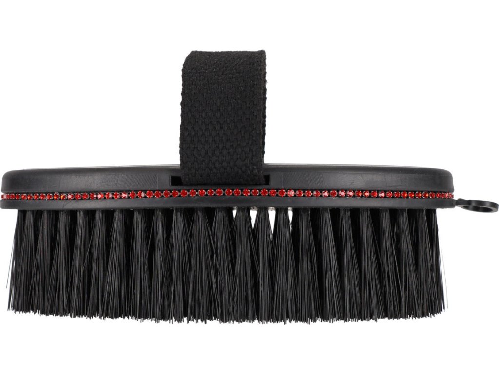 Měkký kartáč, který je vhodný pro každodenní péči o srst koně. Kombinace černých a červených štětin účinně odstraňuje prach, jemné nečistoty i uvolněnou srst. Elegantní detaily z kamínků dodávají kartáči stylový vzhled. Pevné nylonové poutko zajišťuje jistý a pohodlný úchop.