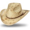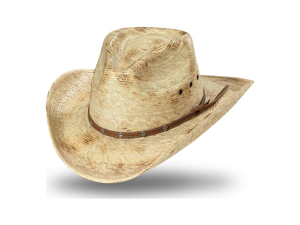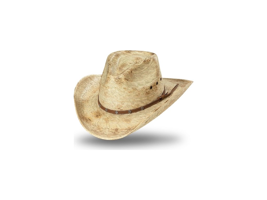 Westernový slamený klobúk so zaujímavým efektom. Ozdobný pás v hnedej farbe je zdobený conchos. Je vybavený nastaviteľným vnútorným pásom. Vďaka použitému materiálu je vhodný na leto, ľahko sa tvaruje.
