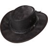 Westernový klobúk z prvotriednej byvolej kože s dokonale prepracovaným ozdobným koženým pásom. Vnútorná strana je vybavená mäkkým elastickým pásom pre pohodlné nosenie a nastaviteľným podbradným koženým pásom.