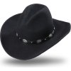 Westernový klobúk z vlnenej plsti s vnútornou podšívkou. Odolný voči vode a pokrčeniu s tvarovateľnou krempou. Klobúk je vybavený nastaviteľným vnútorným pásom.