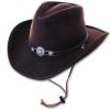 Westernový klobúk z vlnenej plsti s ozdobnou koženou páskou a conchom. Vnútorná strana je vybavená mäkkým polstrovaním pre pohodlné nosenie a podbradnou šnúrkou. Vďaka použitému materiálu sa dá klobúk ľahko vytvarovať.