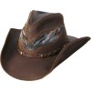 Westernový klobúk z prvotriednej hnedej hovädzej kože.Je zdobený koženou stuhou s niekoľkými kovovými nitmi a krásnym prešívaním s perím. Hovädzia koža zaručuje odolnosť a nepremokavosť, klobúk je ideálny do každého počasia. Vďaka hladkej a veľmi pevnej koži nehrozí ľahké poškriabanie klobúka. Vybavený vnútorným potným pásom, ktorý je elastický a vďaka tomu sa klobúk ľahko prispôsobí veľkosti hlavy.